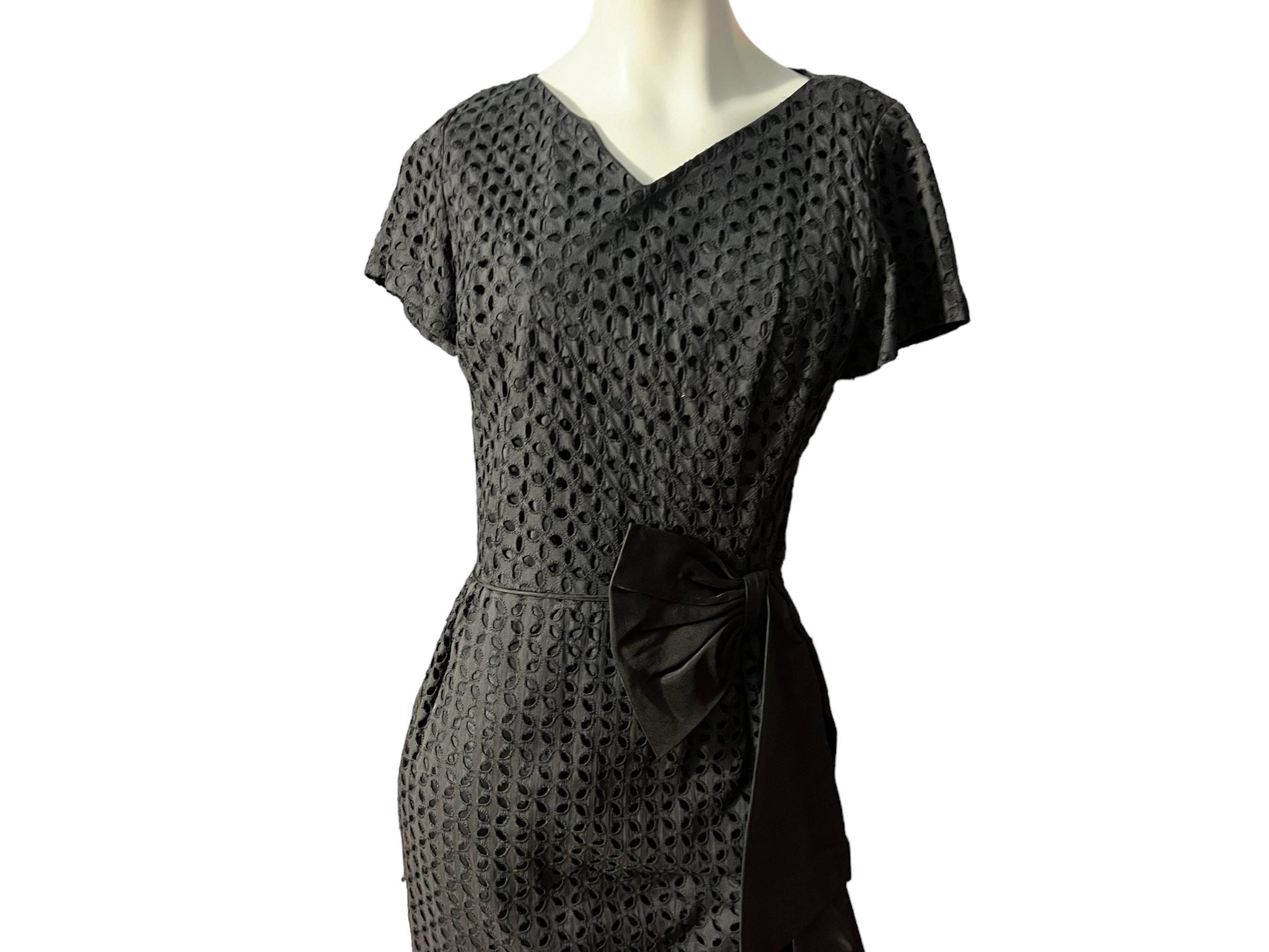 Vintage black 50's fitted dress, tag says A Topaz Original, dress zips up the back, eyelet, fully lined, huge bow on side waist, dress has 2 rips in eyelet- see pic, other than that in good vintage condition, measurements are