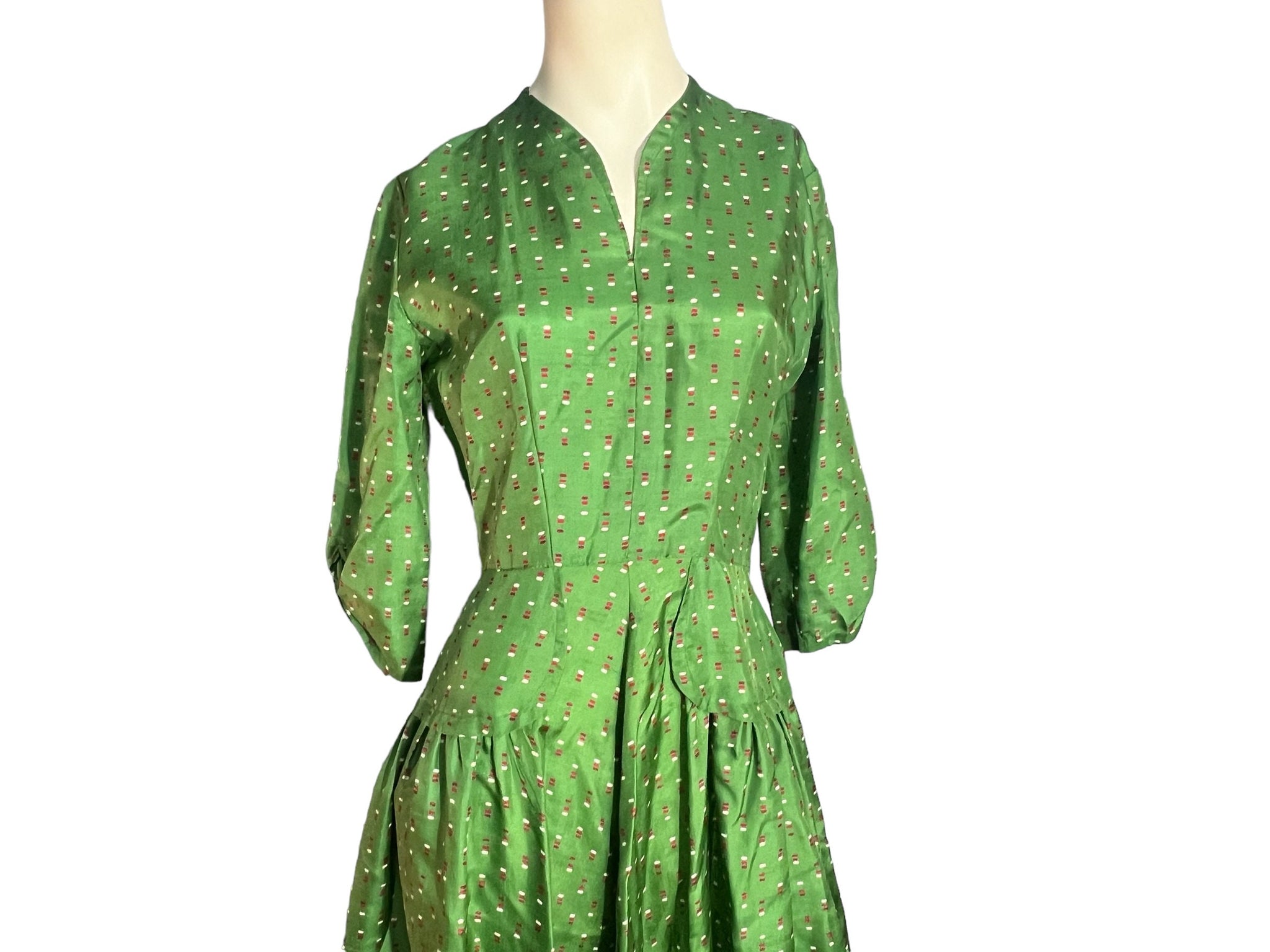 Vintage 40's 50's dress, looks to be handmade, feels like a bric blend. Dress is well constructed, zips on the side, top is fitted, with flare skirt, half sleeves with gathered detailing. Dress is in great condition, measurements are