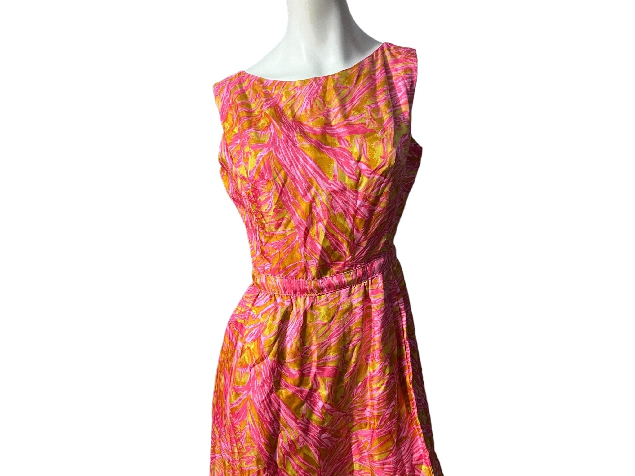 Vintage pink and mustard yellow day dress, tag says Suzy Perette, feels like silk, fully lined, zips up the back, fitted at the waist, has pockets. Dress is in great vintage condition, measurements are