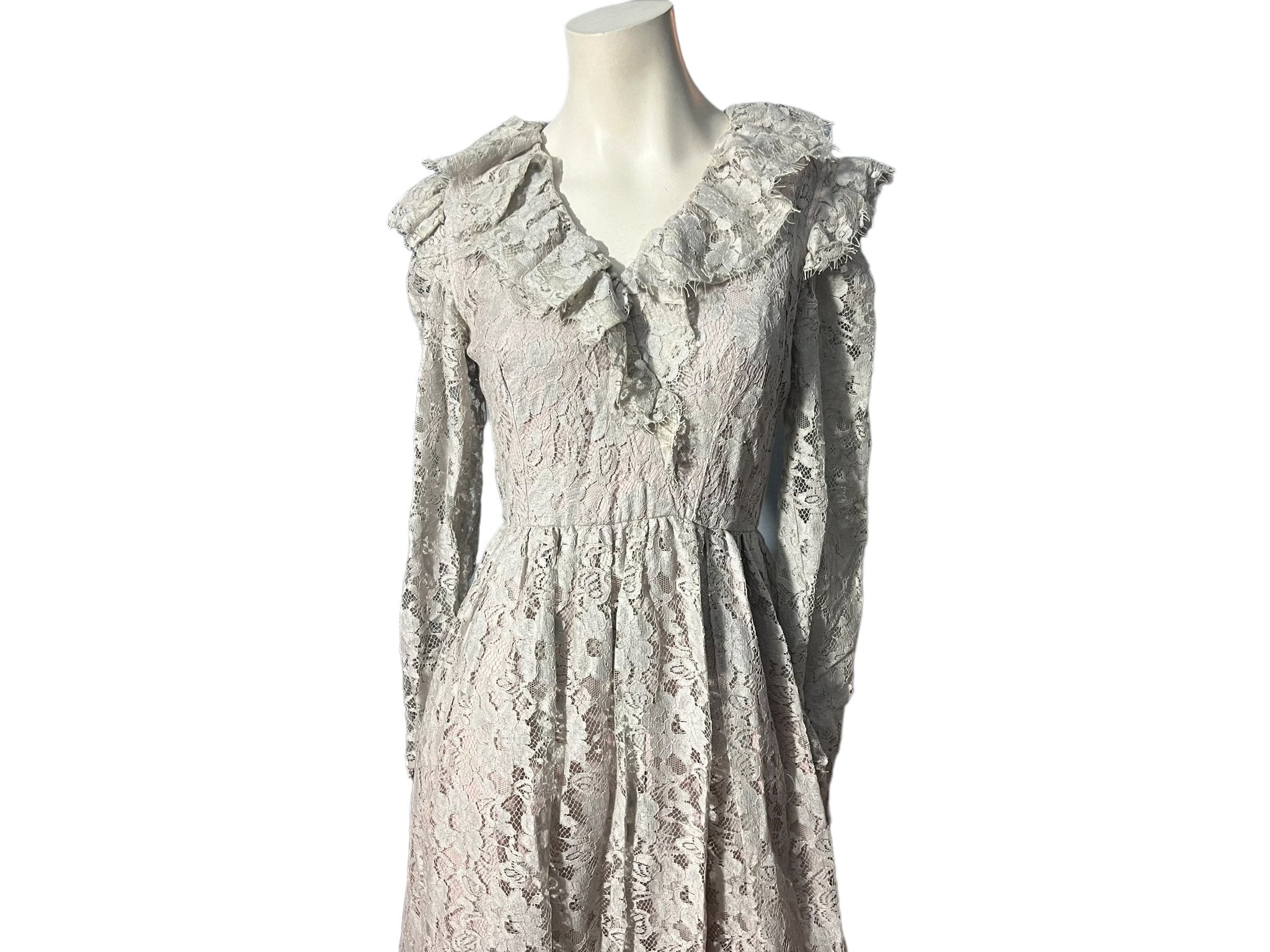 Vintage lace 60's maxi dress, lace is gray, underneath is pink, says sz 12, but follow measurements. Dress zips up the back, has lace on the bust, v neck, fitted top, full skirt. Dress is in good vintage condition, measurements are
