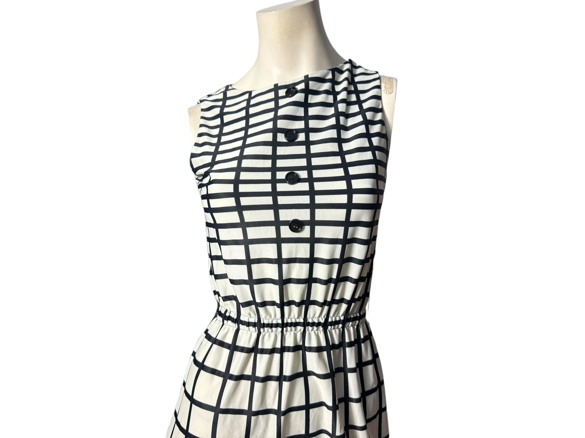 Vintage 70's handmade black & white dress, material feels like nylon, zips up the back, has elastic at the waist, decorative buttons on the front. Dress is in great condition, measurements are