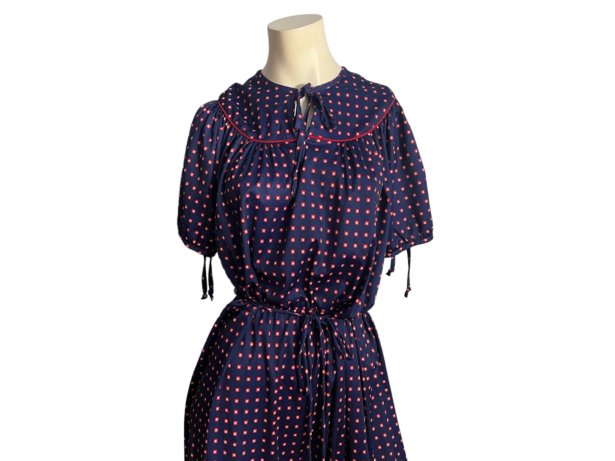 Vintage red, white and blue dress, has small little squares, no tags, material is polyester. Dress is lightweight, ties at the neck, elastic waist, has original tie belt. Dress is in great condition, measurements are