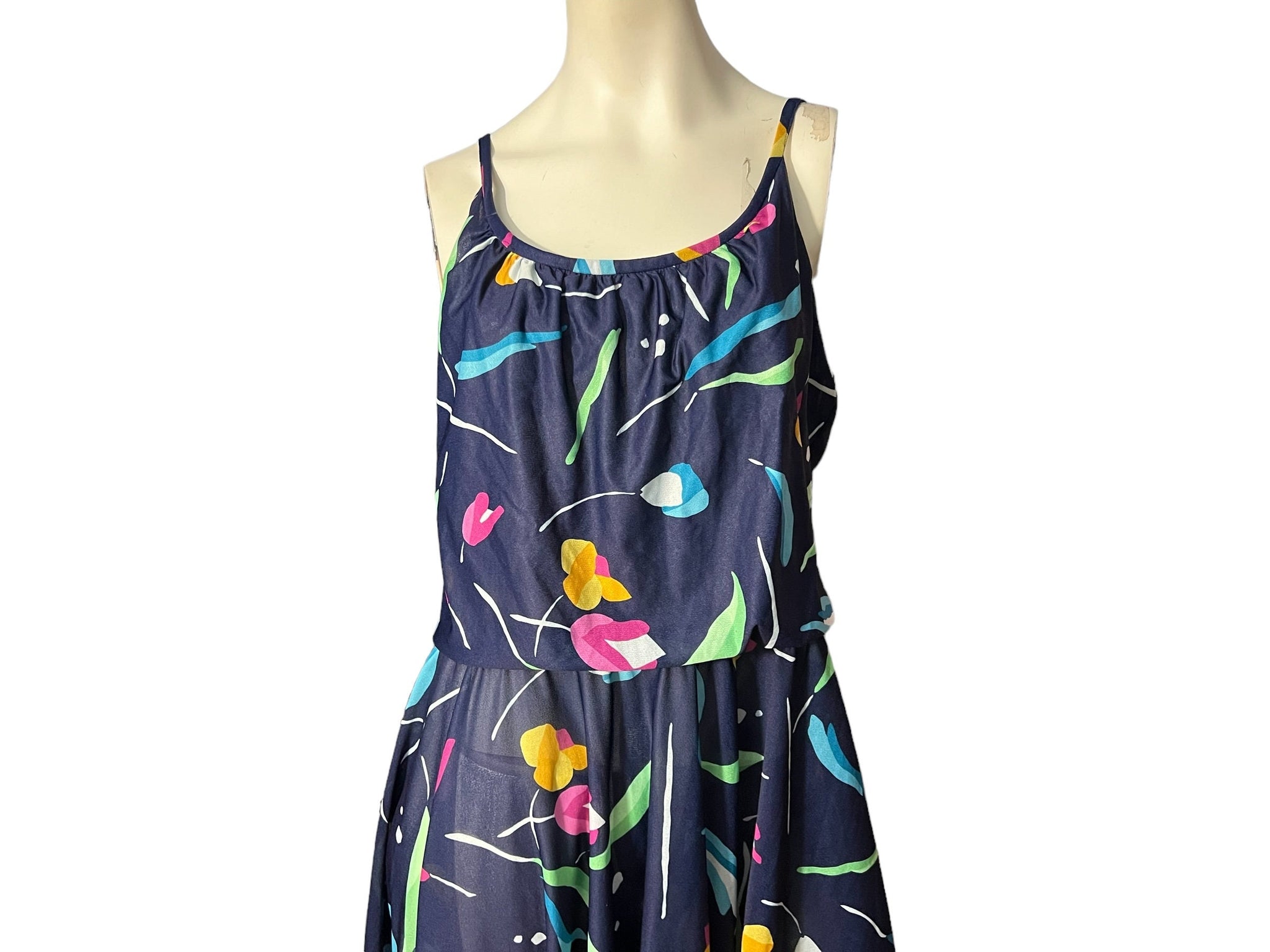 Vintage 70's dress, tag says It's a Leigh, sz 16, feels like polyester. Dress is semi sheer, elastic waist, fold over bust. Dress is in good vintage condition, measurements are
