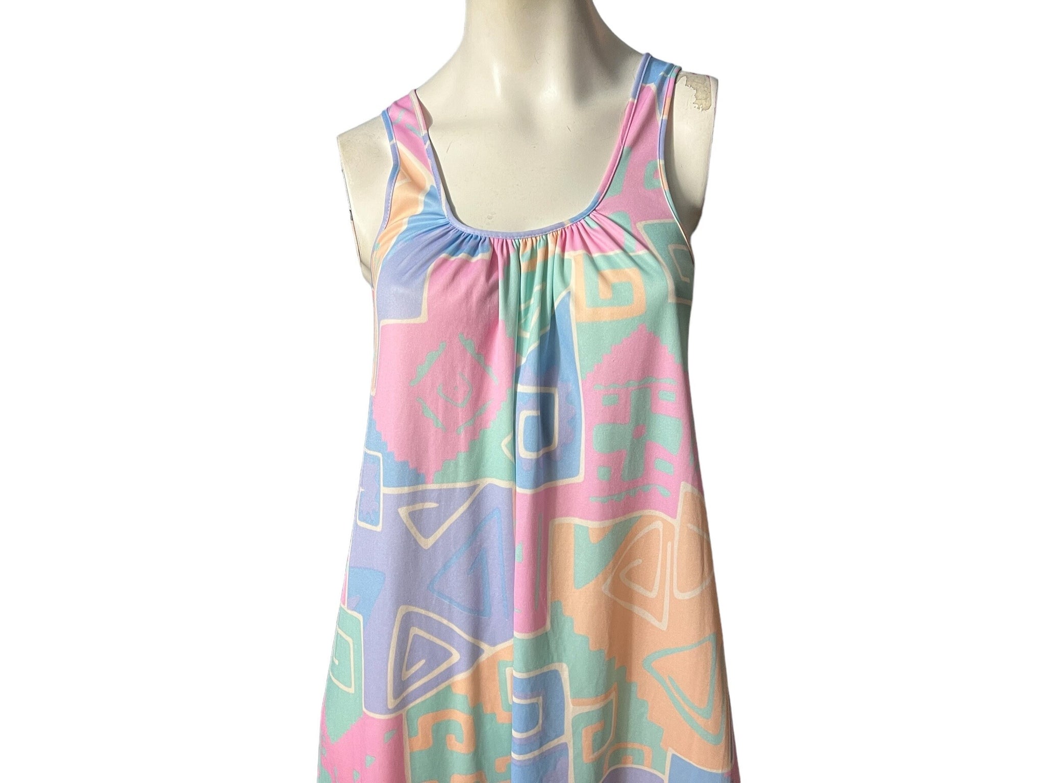 Vintage long 70's maxi dress, tag says Travel-lite, no size. Dress feels like a stretch thin bathing suit material. Dress is in great condition, measurements are