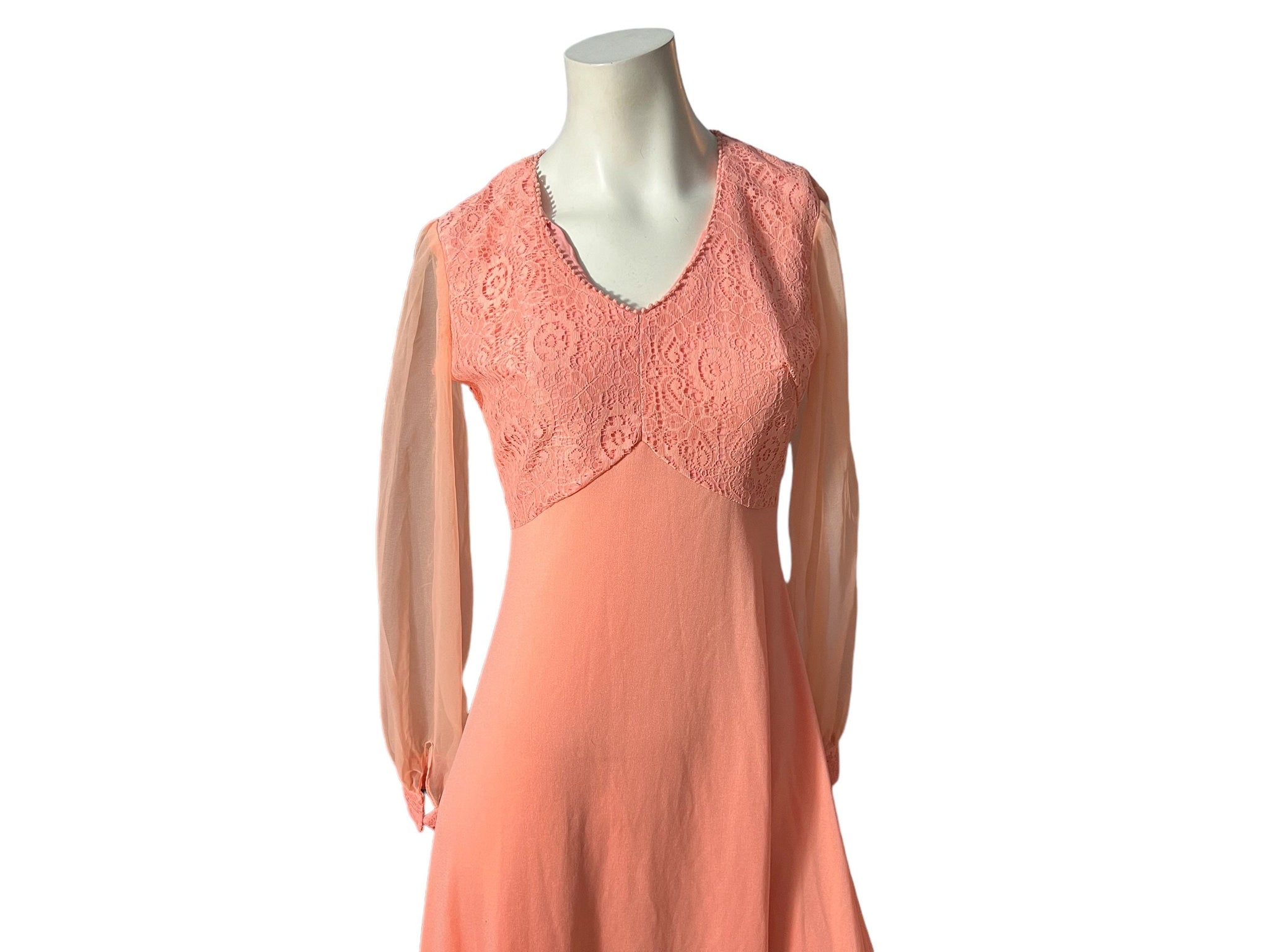 Vintage 70's peach maxi dress, tag says sz 10, polyester. Dress has lace like top, matching wrists, sheer sleeves, zips up the back. Dress is in great vintage condition, measurements are