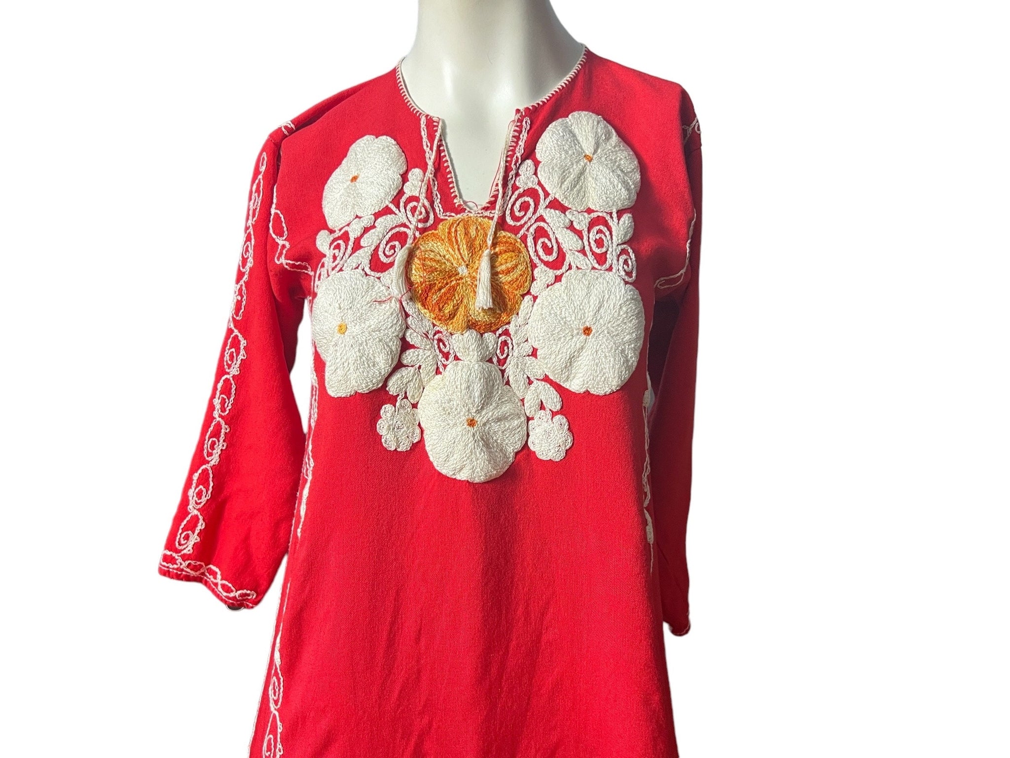 Vintage 70's red embroidered caftan dress, feels like cotton, has beautiful embroidered flowers. Dress is in great condition, measurements are