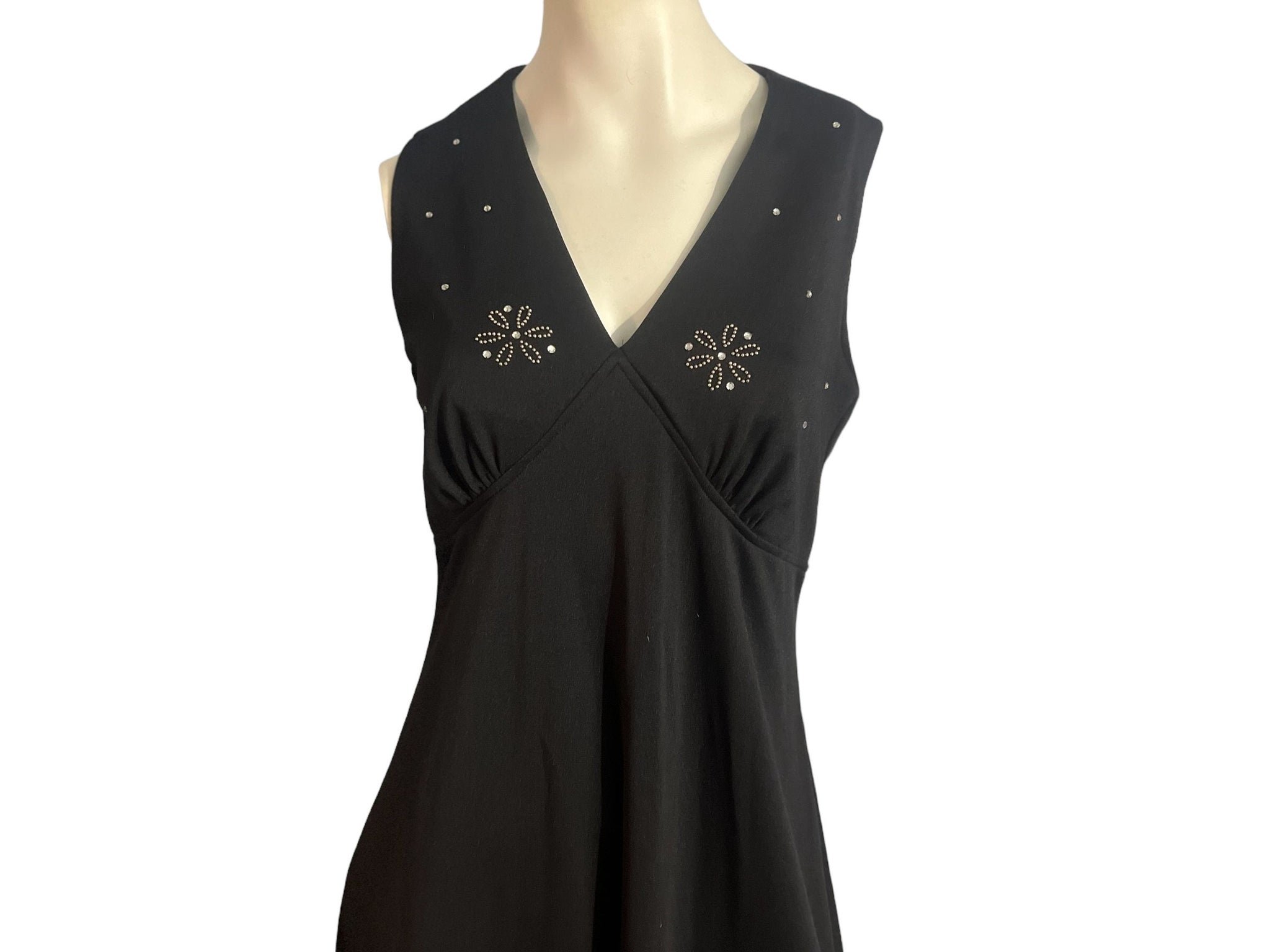Vintage black 70's maxi dress, tag says size 14- follow measurements, no maker- stretch polyester. Dress zips up the back, fitted bust, rhinestones and silver metal flowers. Dress is in great vintage condition, measurements are
