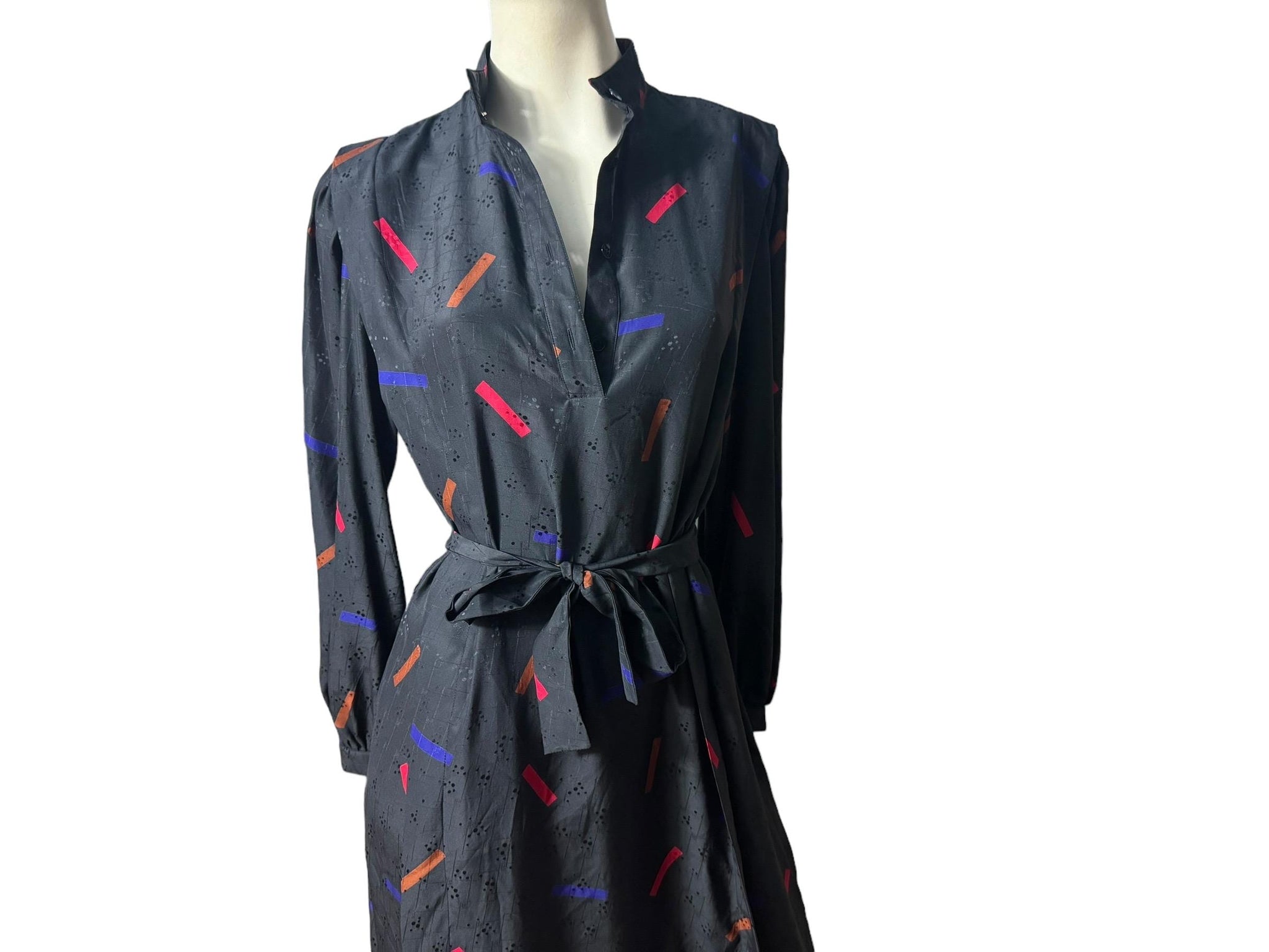 Vintage black mod dress, tag says sz q10- other tag has been cut, feels like polyester. Dress is black, has color design all over, buttons at the neck, tie belt, small shoulder pads. Dress is in great condition, measurements are