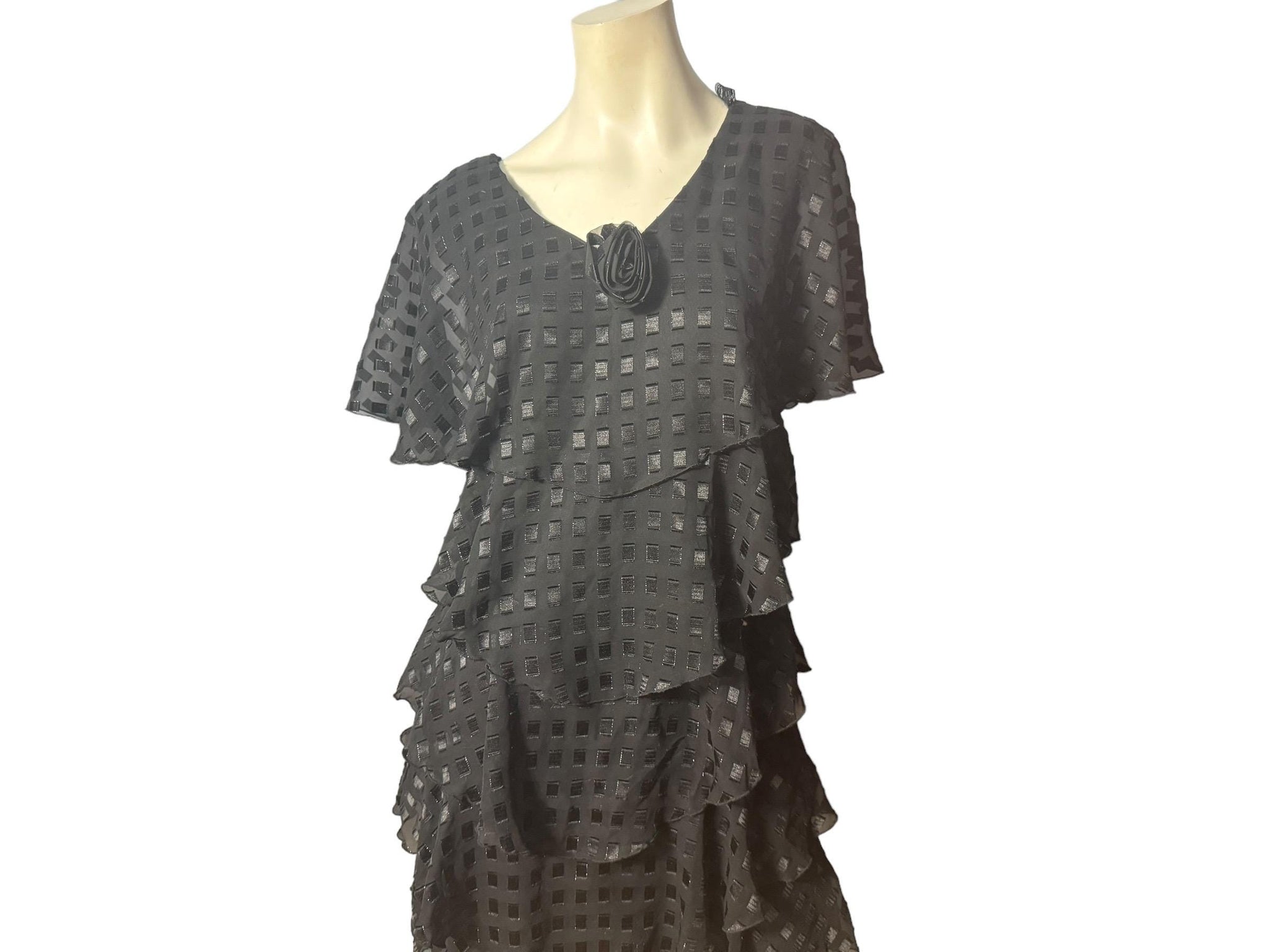 Vintage black ruffle dress, tag says Patra, sz 10, 100% polyester. Dress is slip on, V neck, shoulder pads, flower on the bust, ruffles all the way down, material has squares with silver metallic threading. Dress is in great condition, measurements are