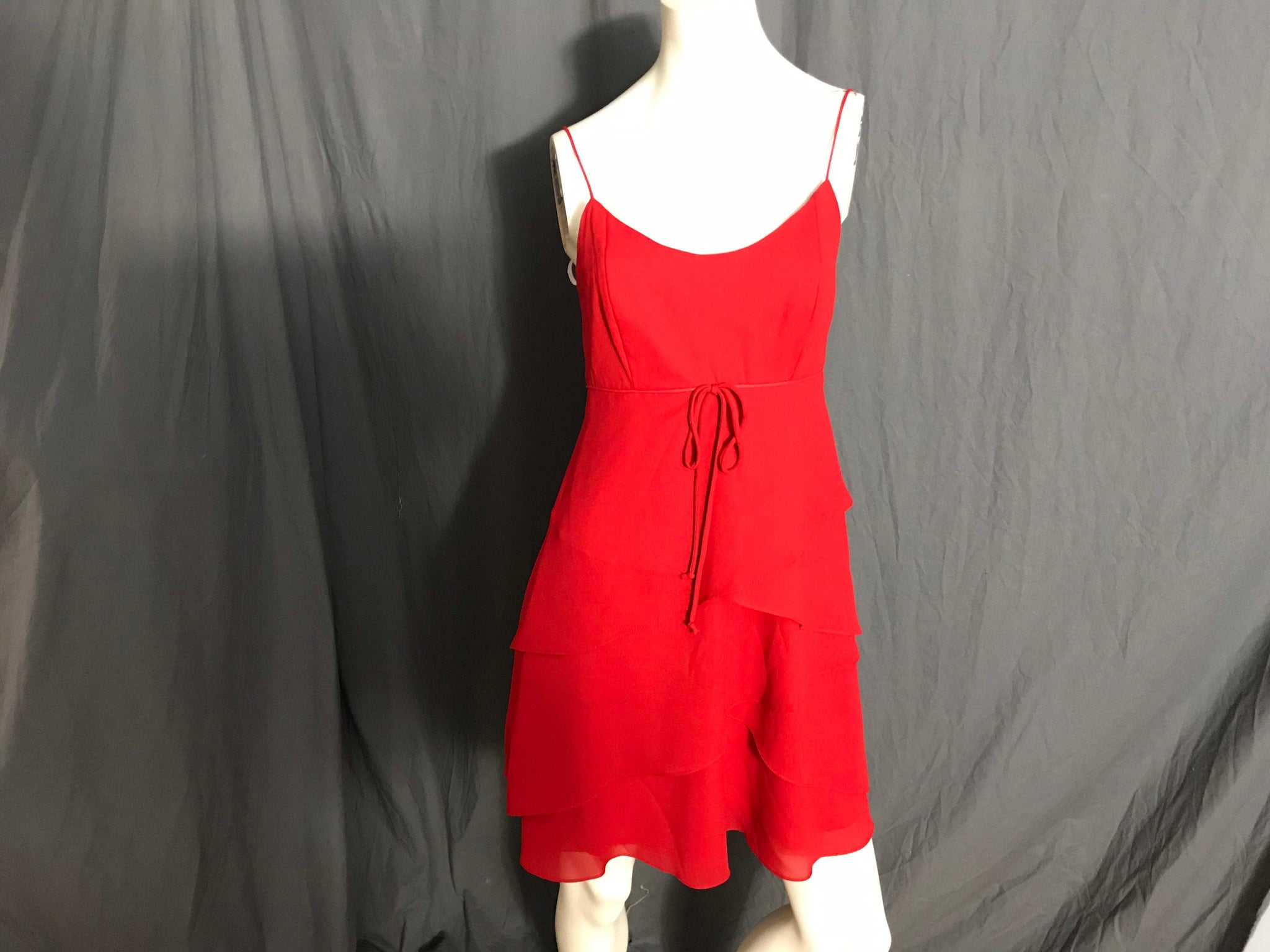 Vintage 1980’s red party dress, tag says Faviana PM New York, sz 7/8, 100% polyester. Dress is fitted at the bust, has a tie decor in the front, dress zips up the back, is fully lined, has multi tiered ruffle skirt. Dress is in great condition, measurements are