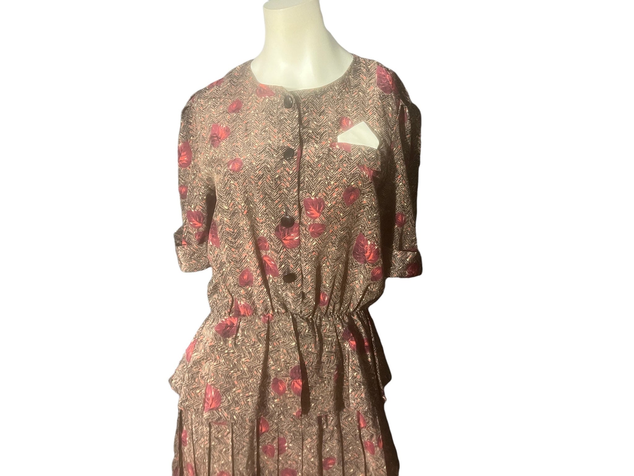 Vintage 80's dress, tag says Perceptions, no size so follow measurements. Dress is a silky polyester blend, buttons up the front, has elastic waist with peplum, pleated skirt, has cuffed sleeves. Dress is in great condition, measurements are
