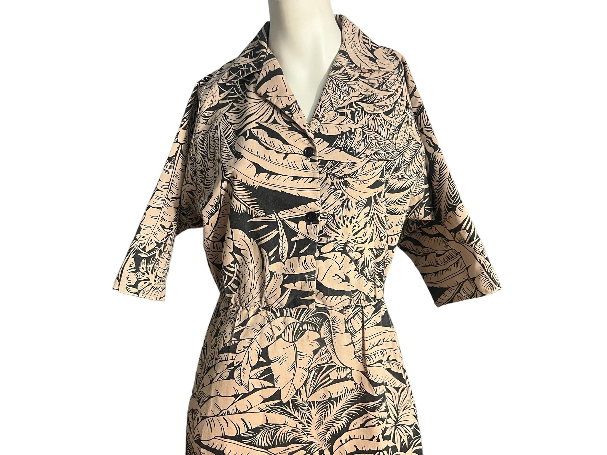 Vintage beige and black 80's dress, tag says sz 5- follow measurements, feels like a poly cotton blend. Dress buttons up the front, has shoulder pads, ruffle type bottom. Only thing to note is a little bit of fading in the pleats at the hip- only noticeable when stretched out. Measurements are