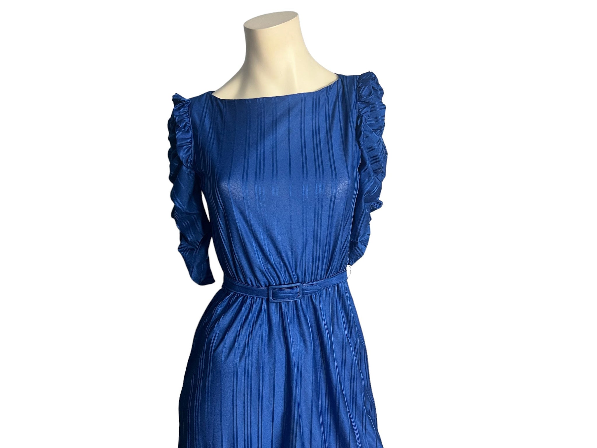 Vintage blue 80's dress, tag says 100% polyester. Dress is semi sheer, has striped pattern, awesome sleeve detailing, has original belt. Dress has elastic waist, is in great condition, measurements are