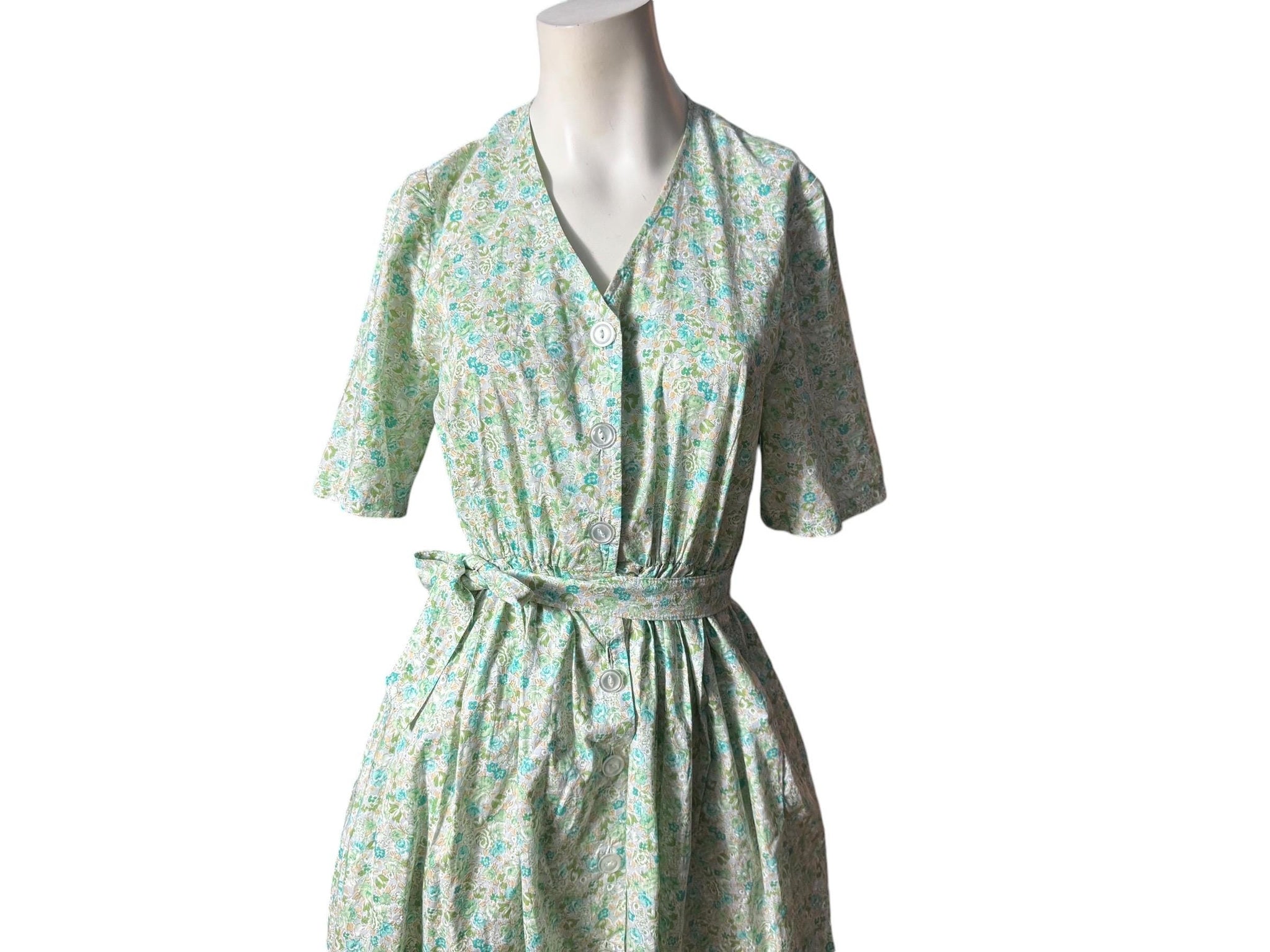 Vintage floral day dress- reproduction, buttons up the front, has elastic waist, full skirt, belt that ties. Dress is thin and lightweight, in great condition, measurements are