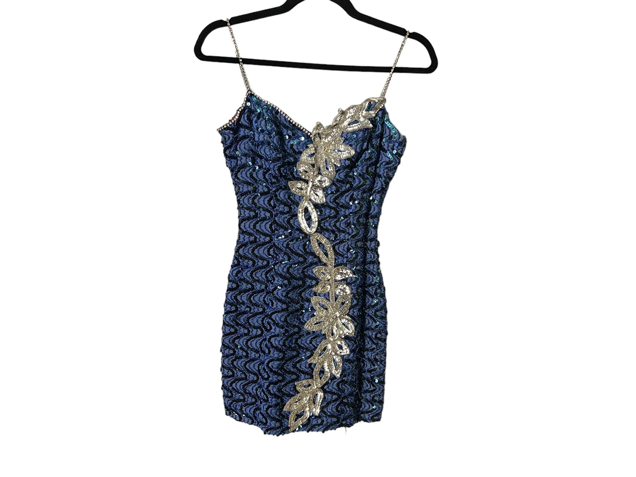 Vintage blue and silver sequin dress, no tags, looks to be handmade. Dress has zip back, rhinestone straps and rhinestones on the bust. Dress is fitted and fully lined. Dress is in great condition, measurements are