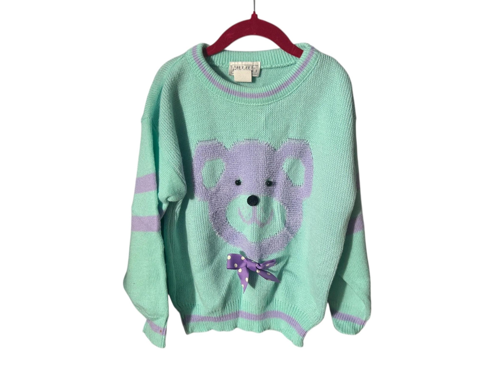 Vintage 80's kids sweater, tag says Jet Set Sweaters, sz 7/8, in great condition, colors are turquoise and purple with teddy bear face.