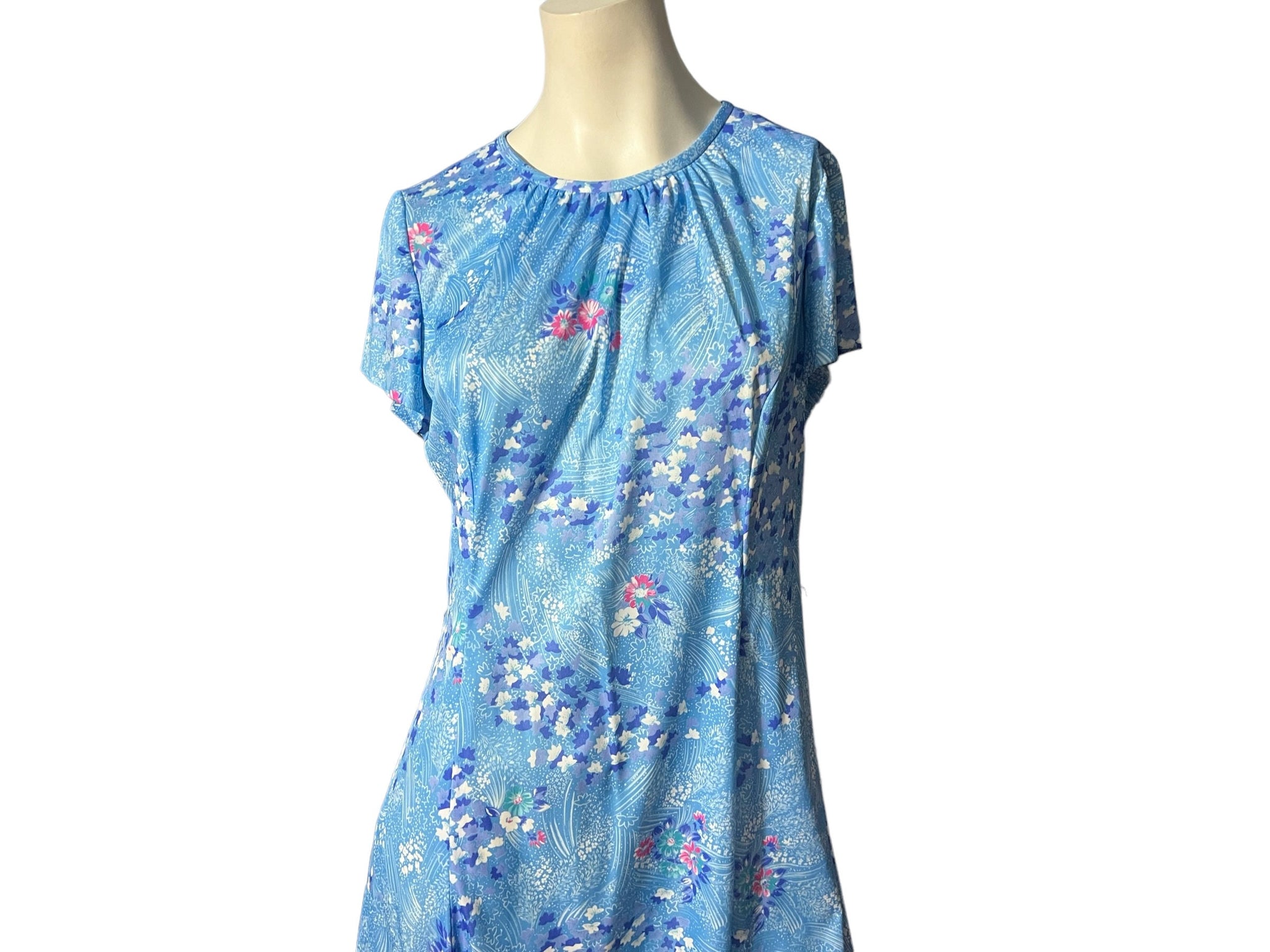 Vintage 70's blue floral dress, tag says Damon Dress, no size- follow measurements, 100% polyester. Dress zips up the back, has gathered neck, belt loops, but no belt. Dress is in good condition, measurements are