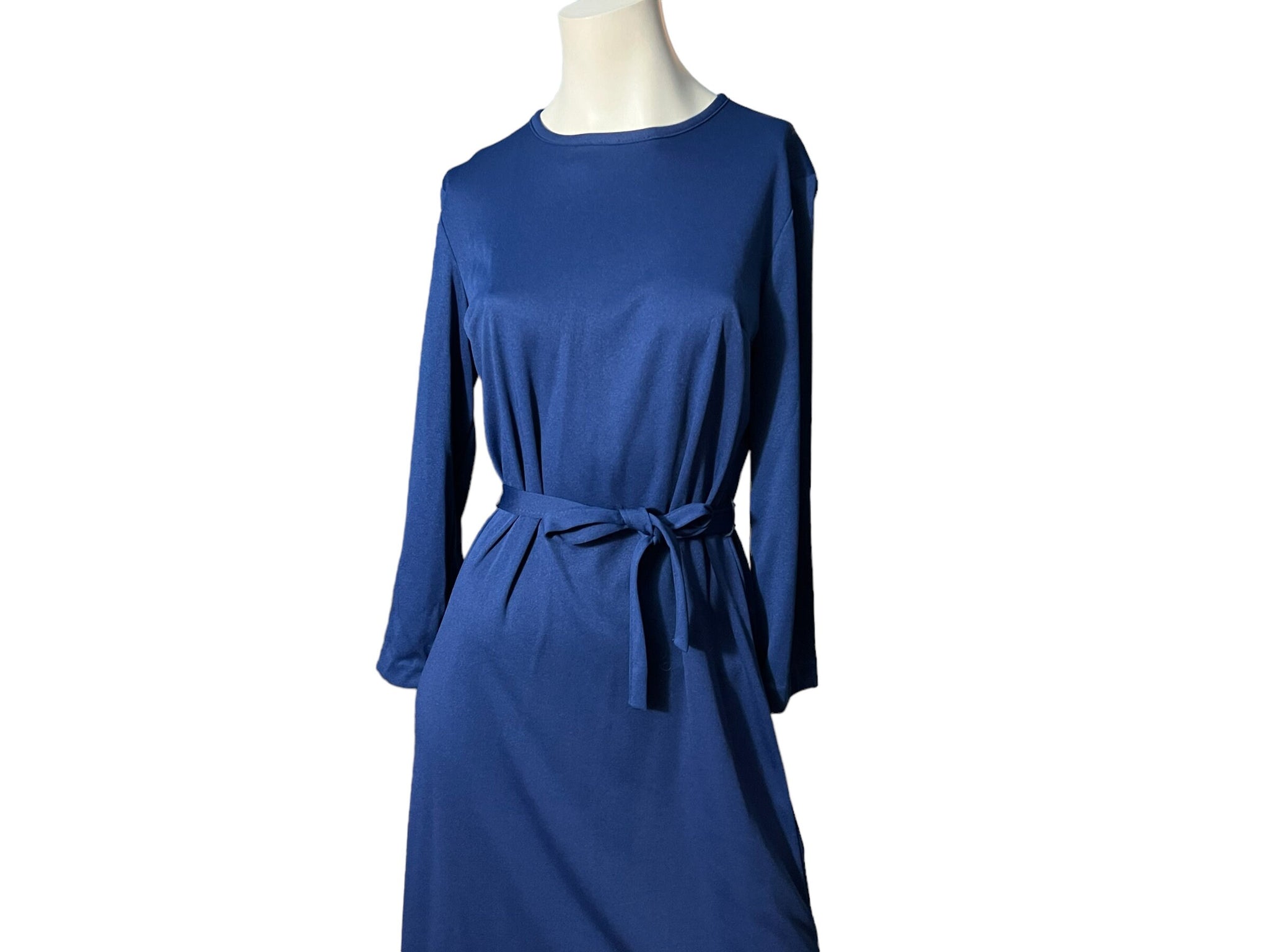 Vintage 70's slinky blue dress, tag says Flutterbye, sz 12, polyester. Dress zips up the back, has original tie belt, fitted, in great vintage condition, measurements are