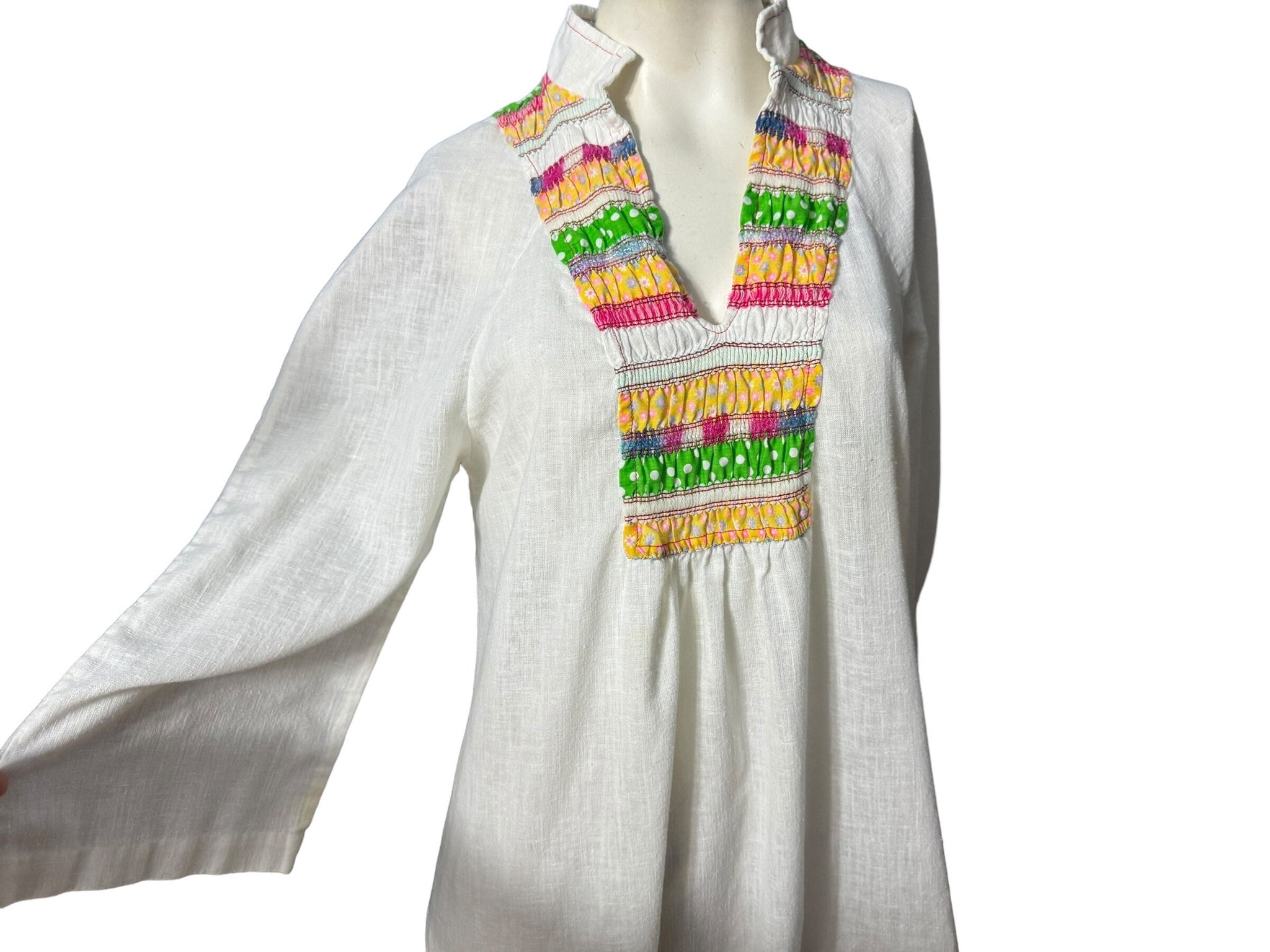 Vintage amazing boho caftan, tag says Sears, zips up the back, feels like cotton, has smocking at the front bust, sleeves that slightly bell, in great condition, measurements are