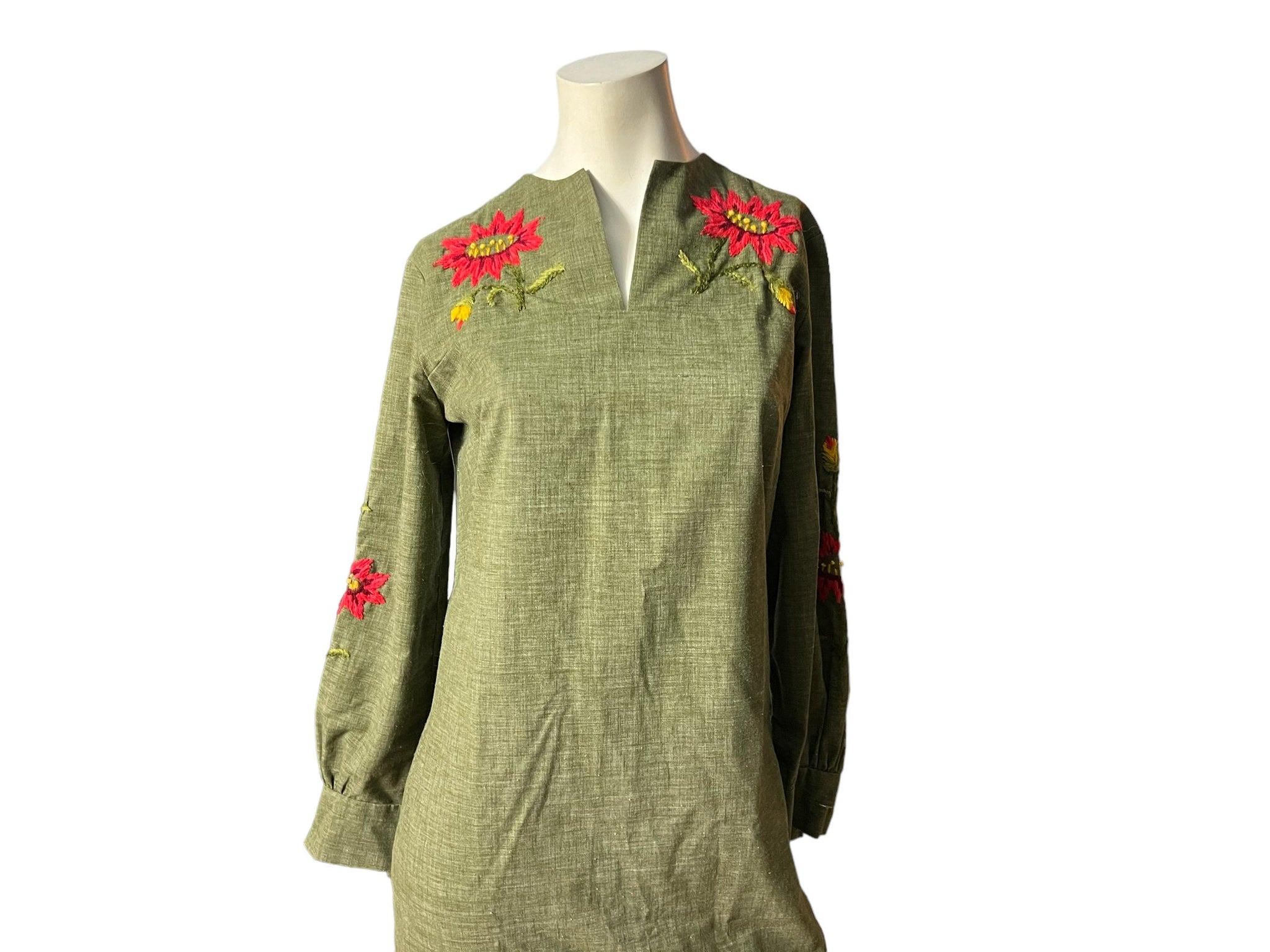 Vintage green embroidered dress, no tags- could be handmade, feels like cotton, red embroidered flowers at the top and down the sleeves, buttons on the cuffs are amazing. Dress is in great condition, measurements are