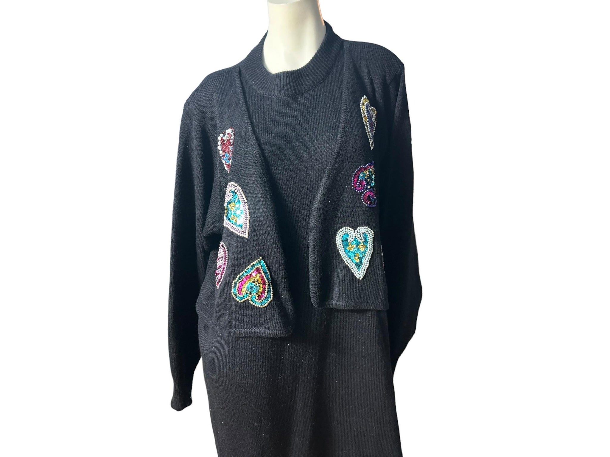 Vintage black sweater dress, tag says Darian, sz 3x, 100% acrylic. Dress is crew neck, has attached vest that has bead and sequin hearts, has shoulder pads. Dress is in great condition, measurements are