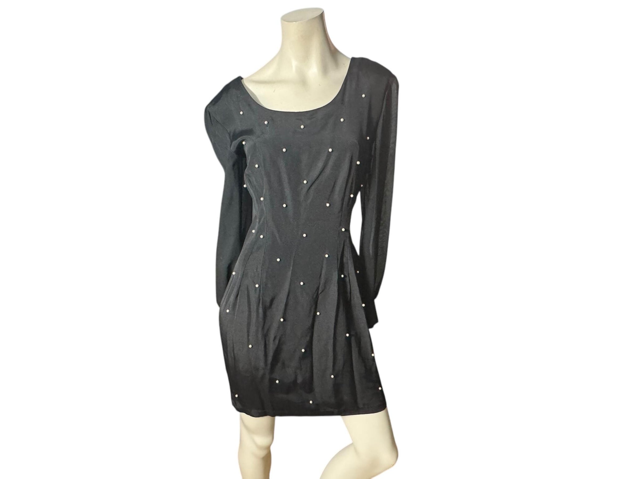 Vintage black 80's dress, tag says Notorious, sz 9, 61% rayon 39% acetate. Dress zips up the back, shoulder pads, pearls on the front, sheer sleeves. Dress is in great condition, measurements