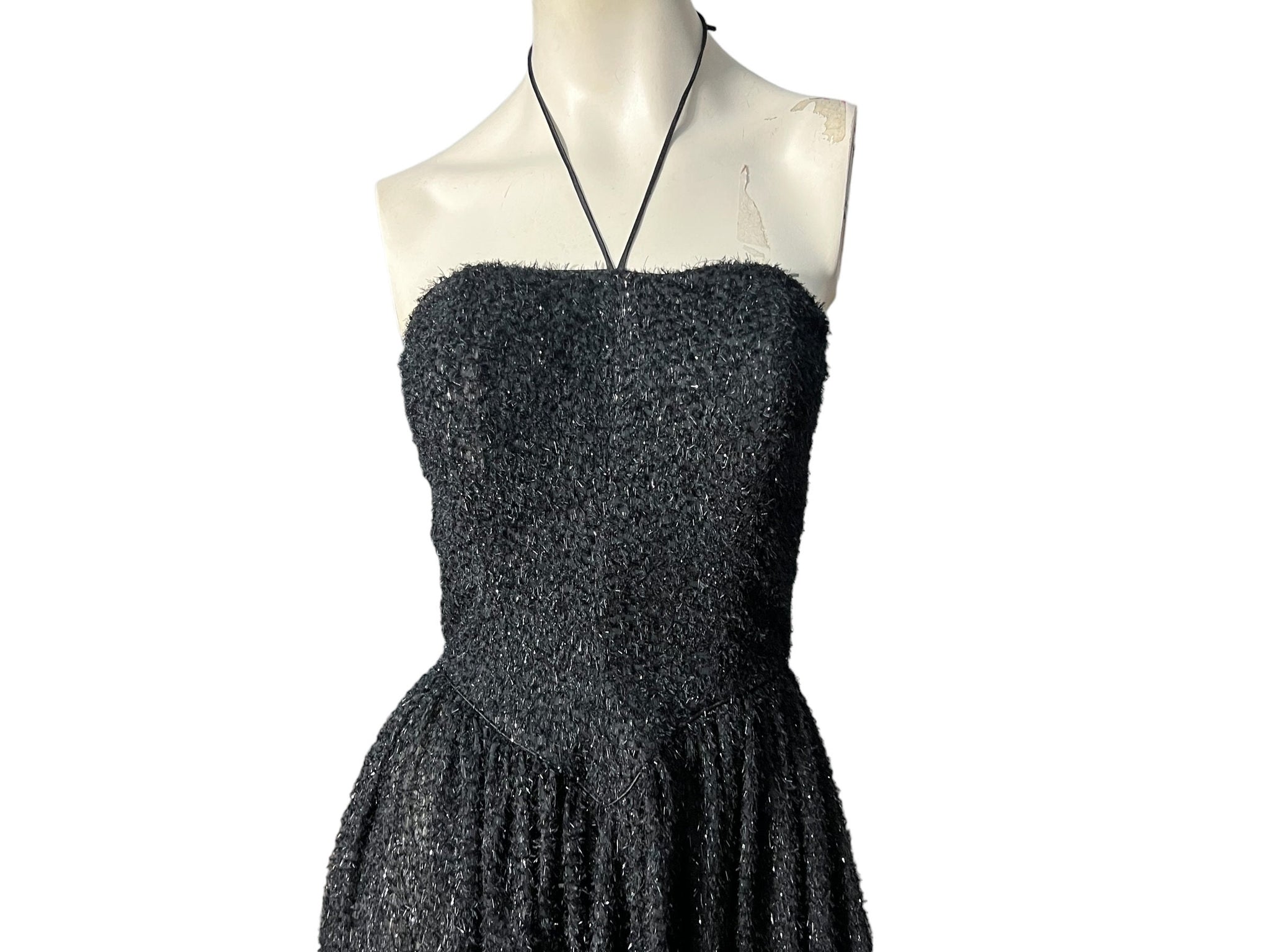 Vintage 80's deadstock party dress, tag says Warren Z, sz 8, 100% cotton. Dress has a fuzzy sparkle sheen, top is boned, ties around the neck, zips up the back, top is fitted, dress is amazing and in great condition, measurements are