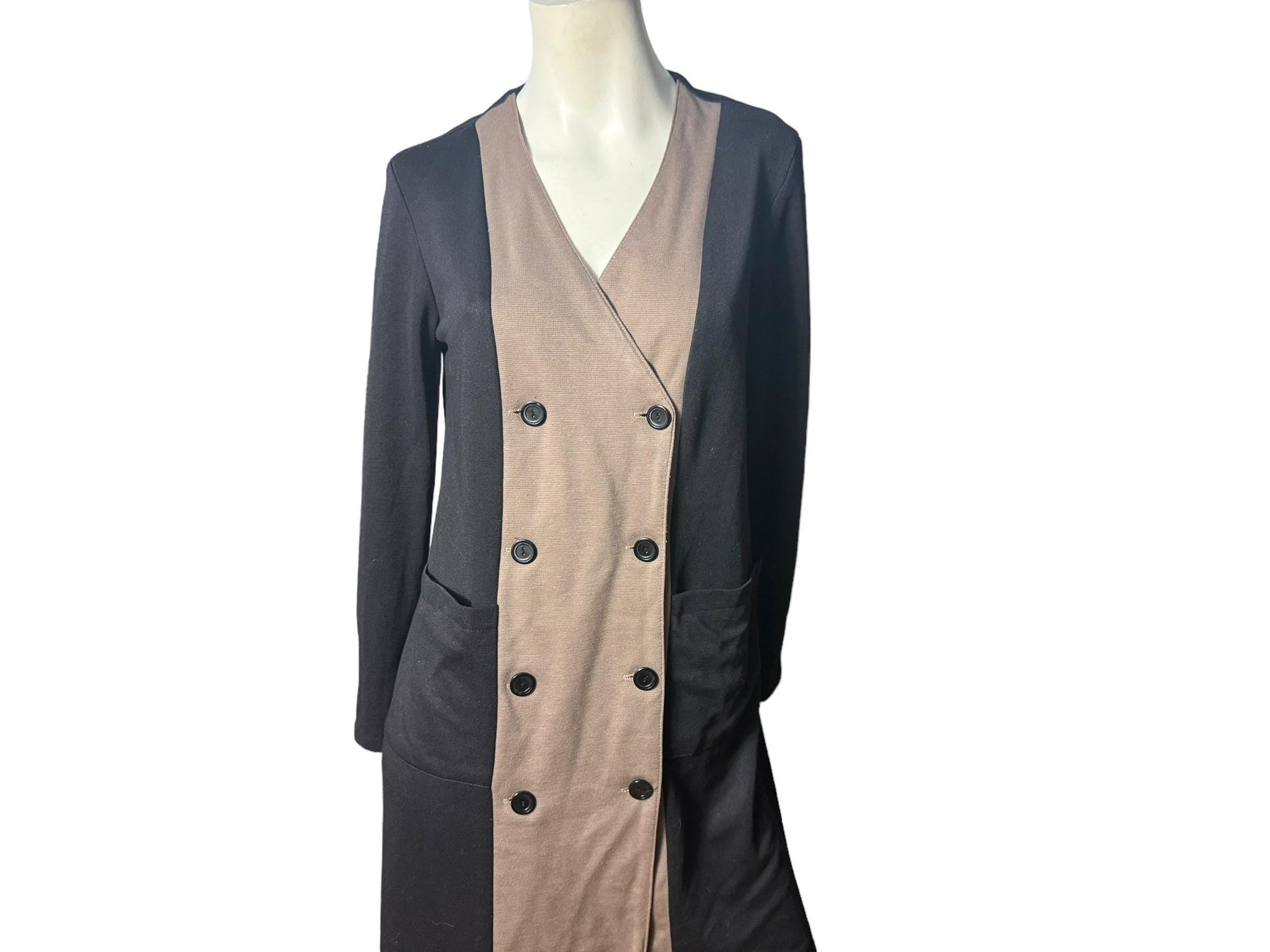 Vintage black and taupe knit dress, tag says Walden Classics, no size- follow measurements. Dress buttons up the front, has shoulder pads, front pockets, slight stretch. Dress is in great condition, measurements are