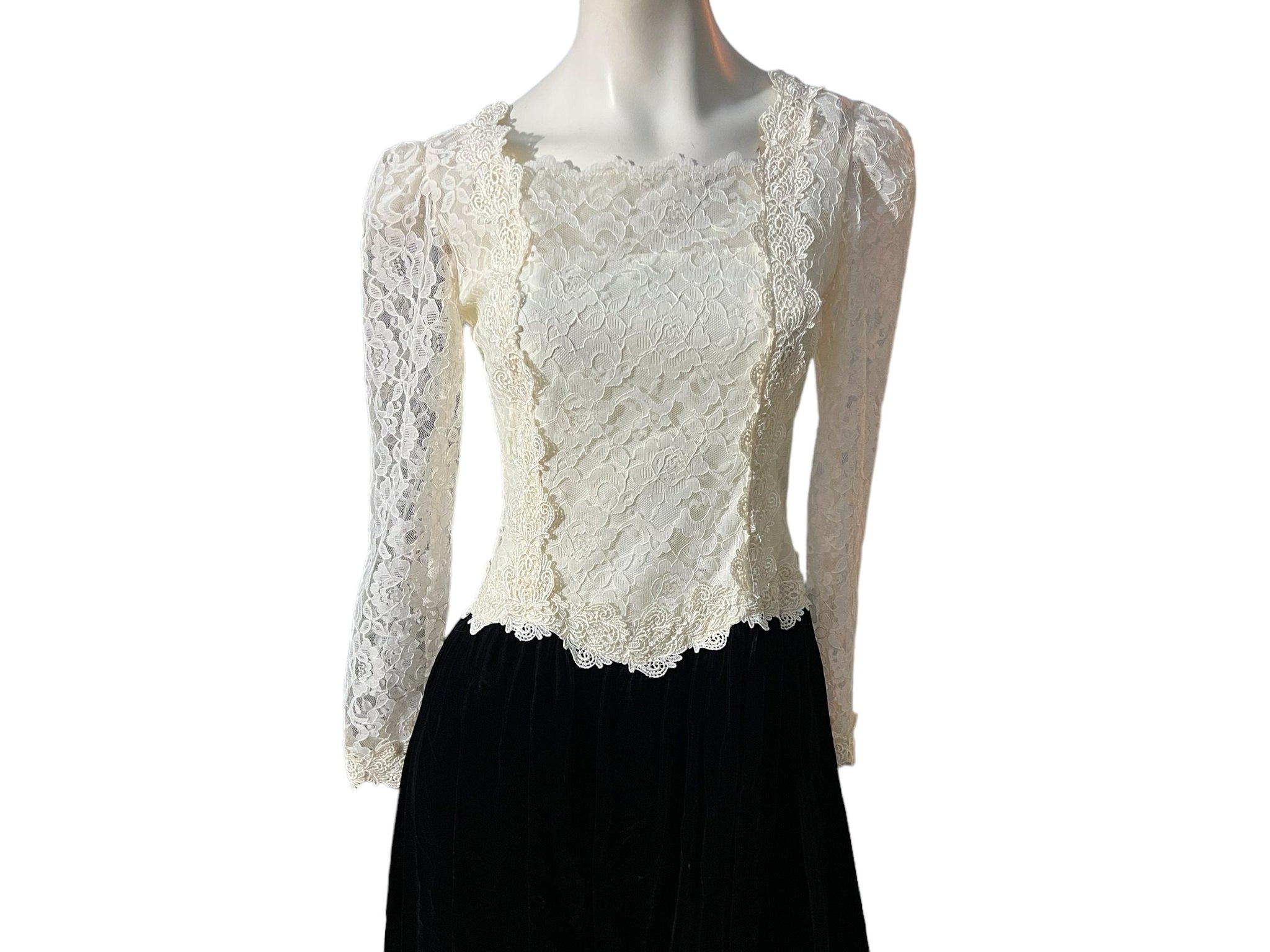 Vintage 80's dress, tag says Nightway, sz 5/6, dress is white lace top, black velvet bottom, dress zips up the back, in great vintage condition, measurements are