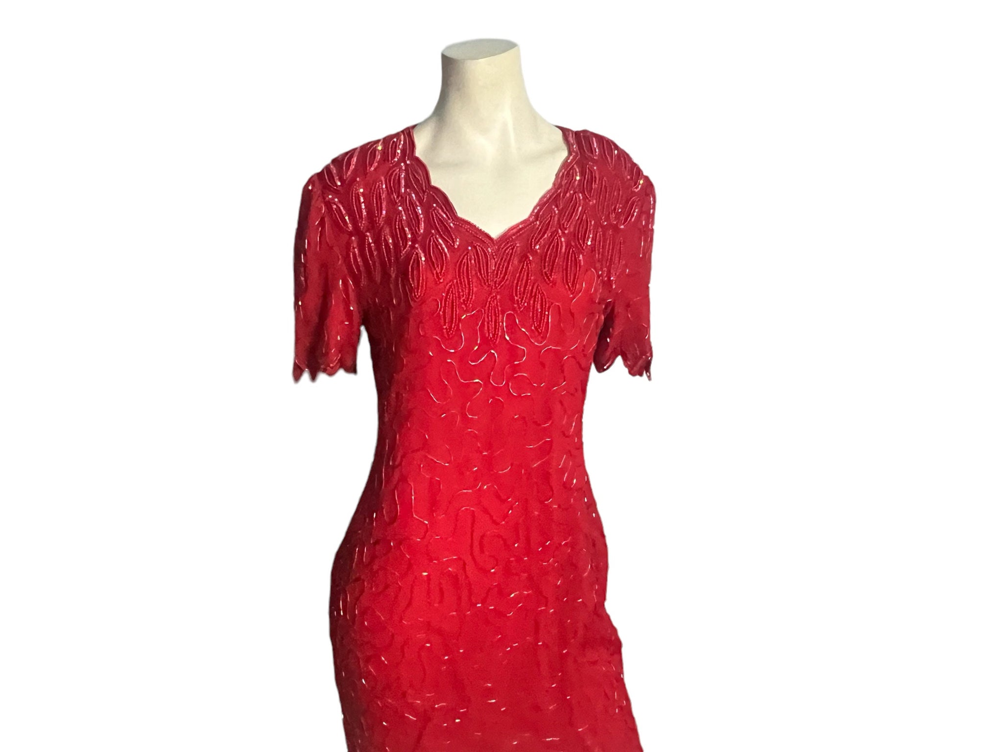 Vintage bead dress, tag says Laurence Kazar, sz PL- so petite large. Dress zips up the back, has shoulder pads, V neck, has sequins and beads, has triangle ends. Dress is in good vintage condition, measurements are