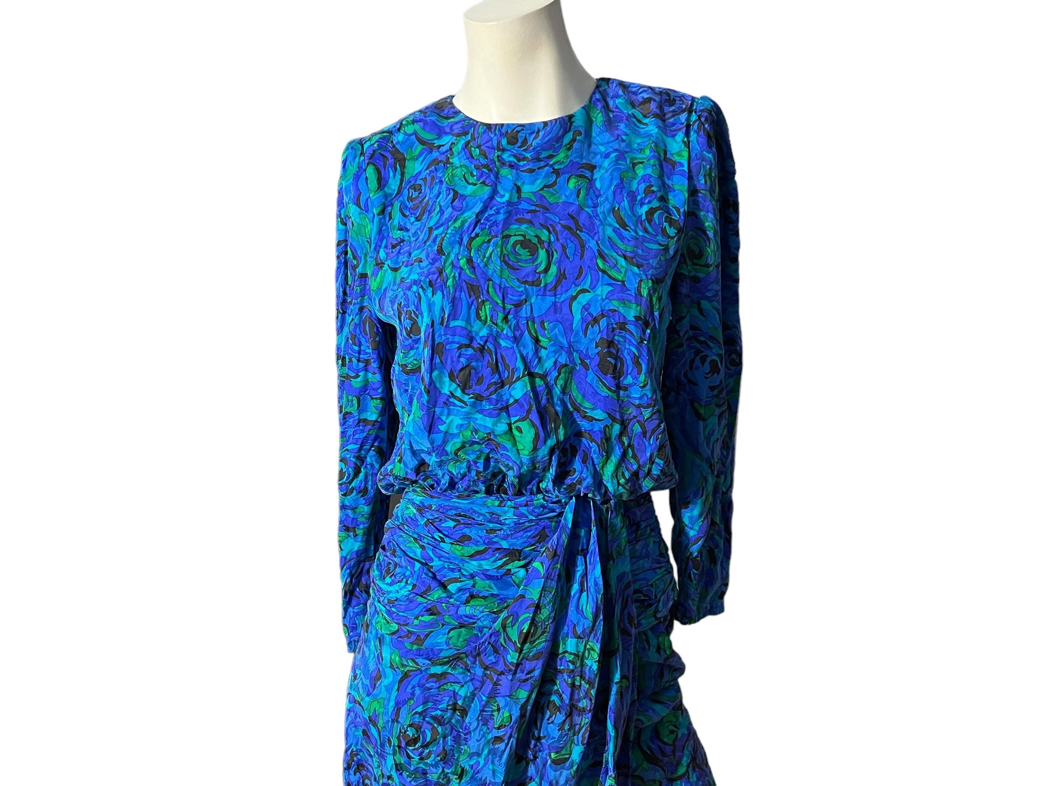Vintage silk dress, tag says Lillie Rubin, size 6, dress buttons down the back and zips up the bottom, dress is fully lined, has shoulder pads. Dress is purple, blue, and green, gathered waist, is in good vintage condition. Measurements are