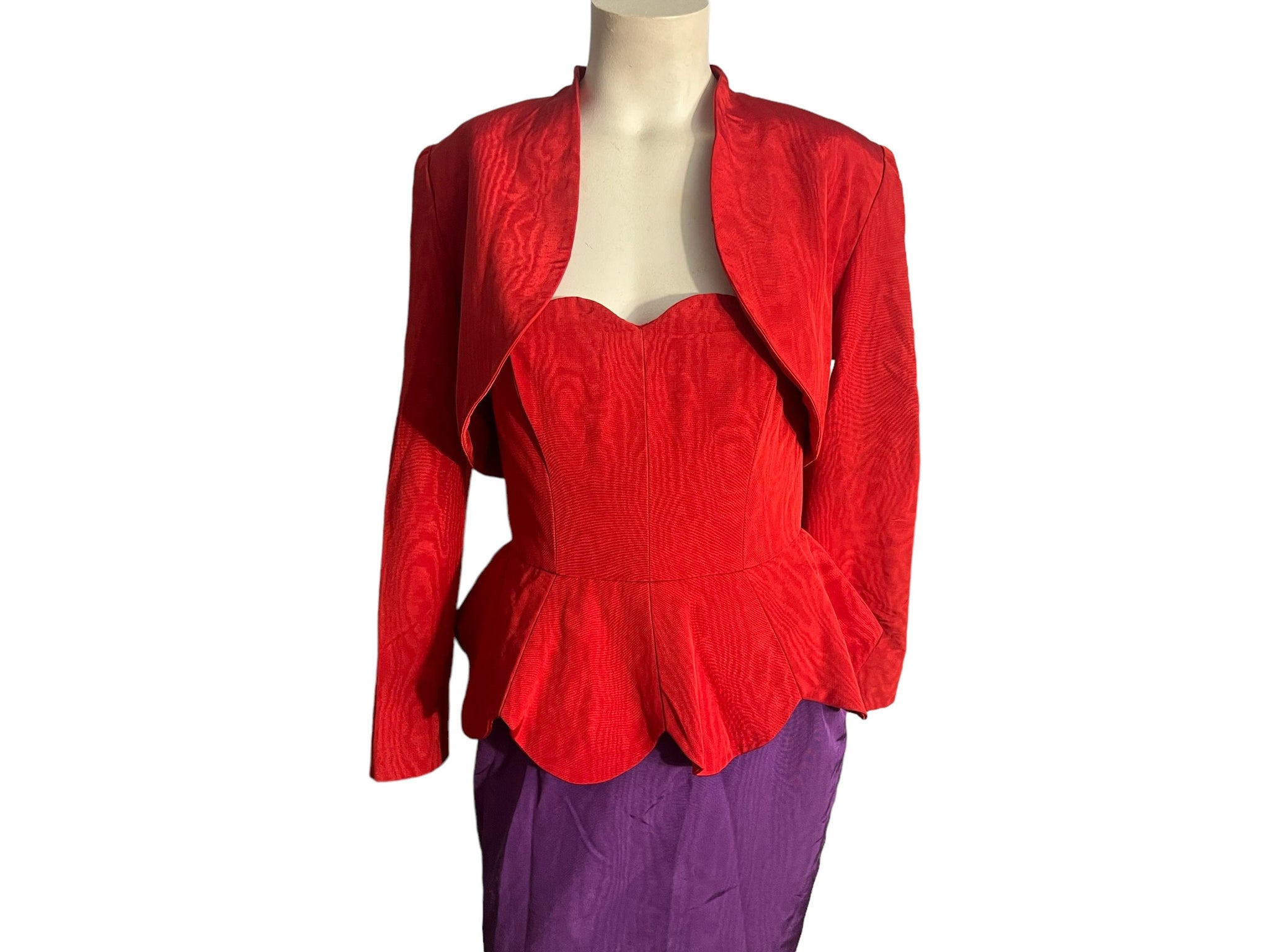 Vintage Lanvin purple and red peplum dress, tags says Lanvin Paris, sz 38. Dress is sleeveless, zips up the back, has built in boning, straight fitted skirt, with a peplum waist that has snaps to connect the ruffle. Jacket is a vibrant red that is short with shoulder pads built in. Ensemble feels like a silky taffeta material, both are in excellent condition.