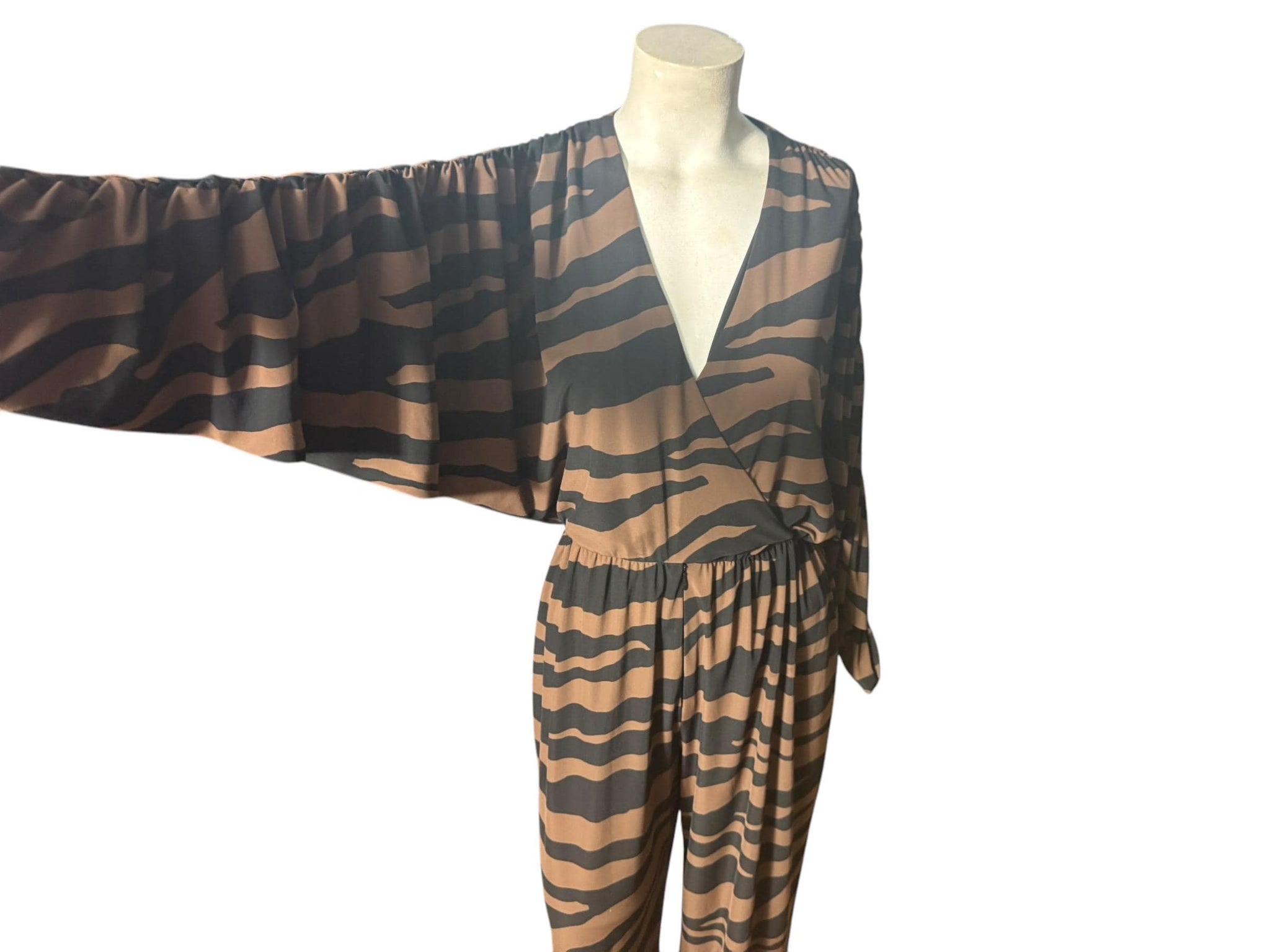 Vintage 80's jumpsuit, tag says Michael Maiello for Pat Richards, seems to be a sz M- follow measurements, material is a blend- has slight stretch. Jumpsuit is black and brown tiger stripes. Jumpsuit snaps and zips up the front, has belt loops-no belt, low cut bust, elastic waist, amazing 80's bat sleeves. Jumpsuit is in great condition, measurements are