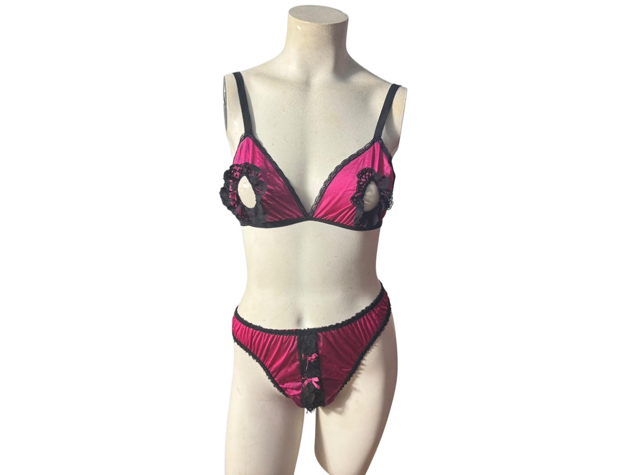 Vintage 80's bra and panty set, tag says Darling, sz- one size, 100% nylon. Bra has holes for the nipples, crotchless panties, only thing to not is the black lace has bleeded on the fabric a bit- other than that in good vintage condition. Would best fit a small to medium.