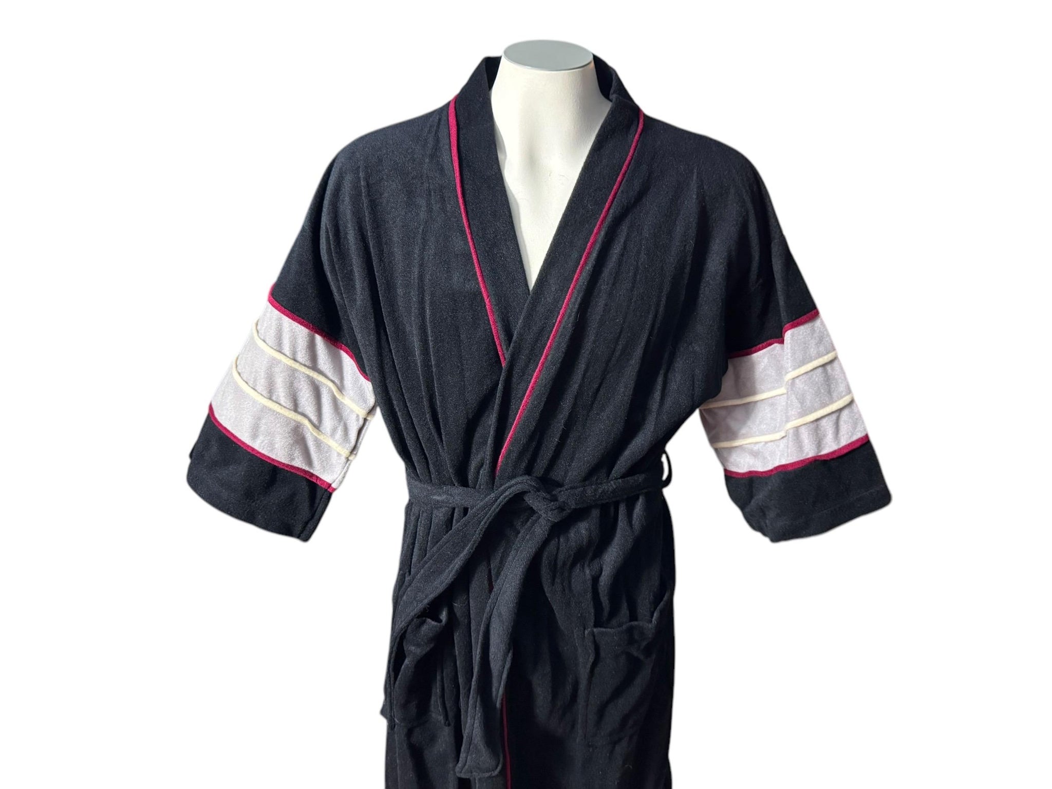 Vintage men's robe, tag says Weldon, one size, robe is polyester and soft, black, gray, maroon and white, has pockets, and original belt, half full sleeves, in great condition, measurements are