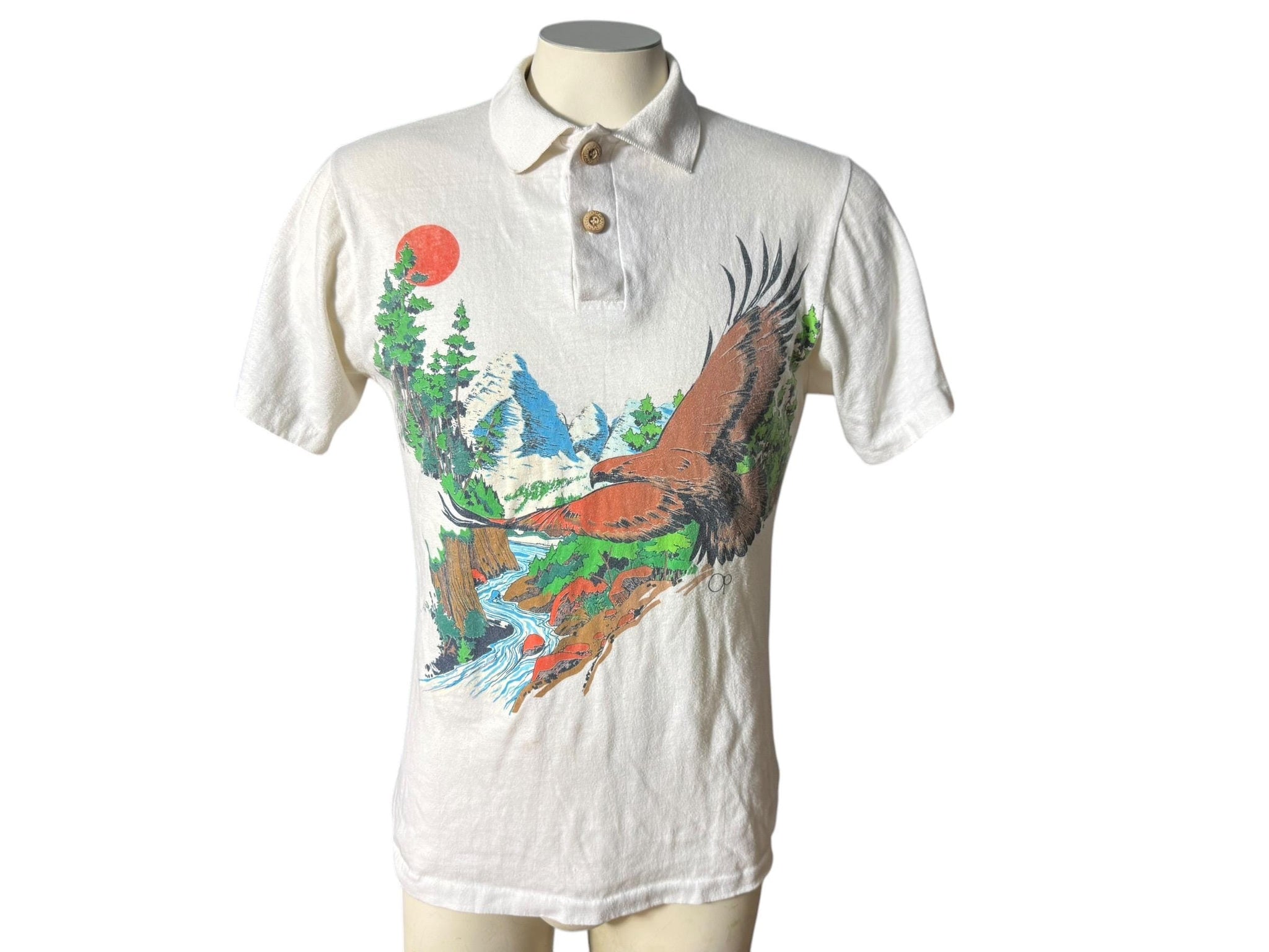 Vintage white surf shirt, tag says OP ocean pacific sunwear, sz L, 50% cotton 50% polyester. Shirt is soft, has eagle mountain scene, is in ok condition- has small discoloration on front, measurements are