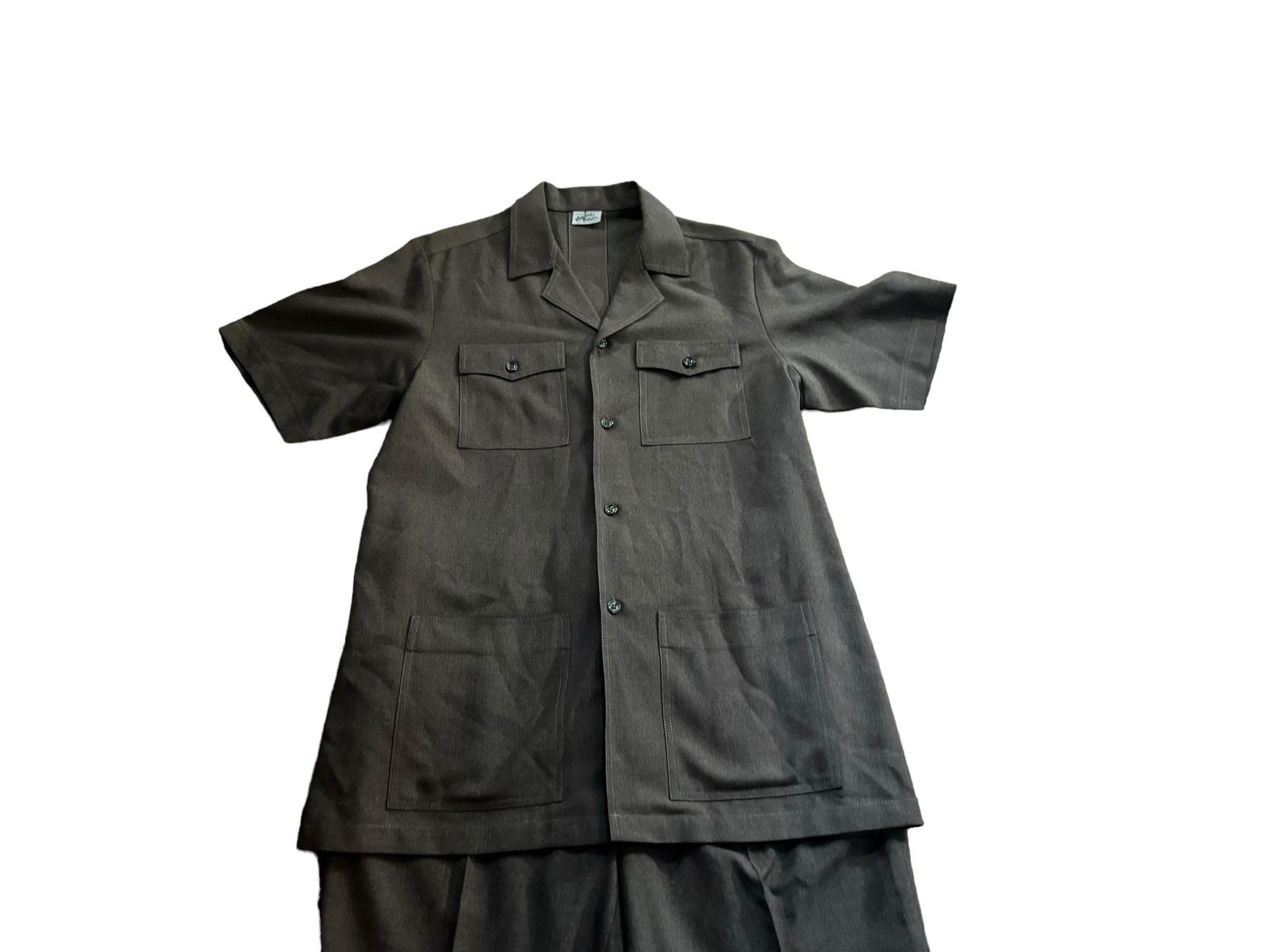 Vintage 70's brown leisure suit, custom made. Suit has no stretch- light weight. Top is button up, 4 pockets, pants zip, clasp, and button, has pleats. Suit is in great condition, measurements are