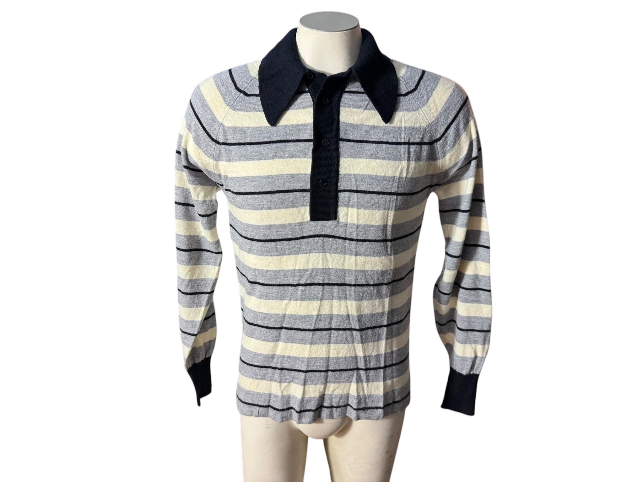 Vintage 70's sweater, tag says Puritan Soft Touch, sz M, 100% acrylic. Sweater is black, gray, & white, striped design, collared. Sweater is in great condition, measurements are