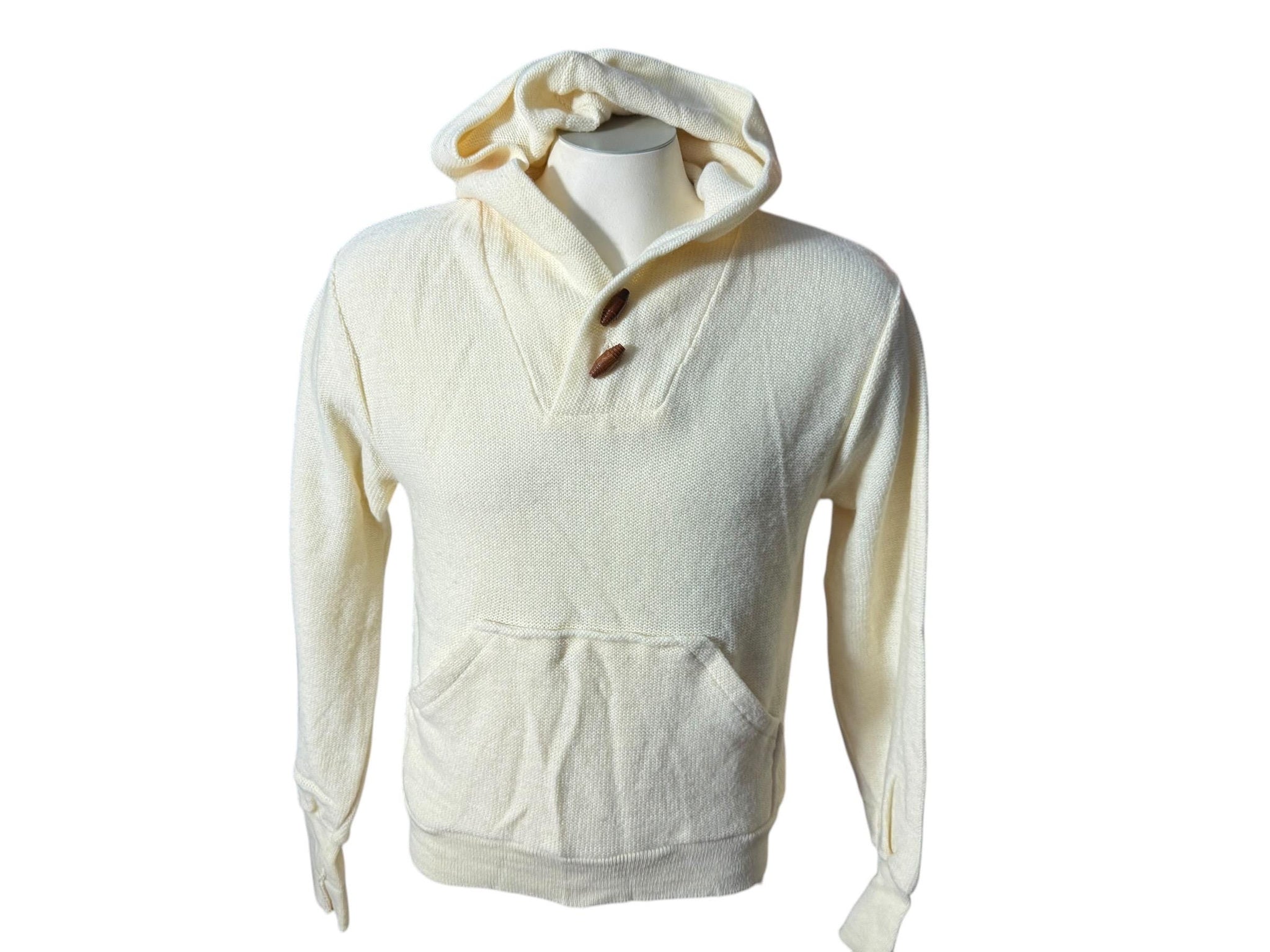Vintage off white hooded pullover sweater, tag says Kings Road, Sears, sz M, 100% orlon acrylic. Sweater has wood buttons, front pockets, in great condition, measurements are