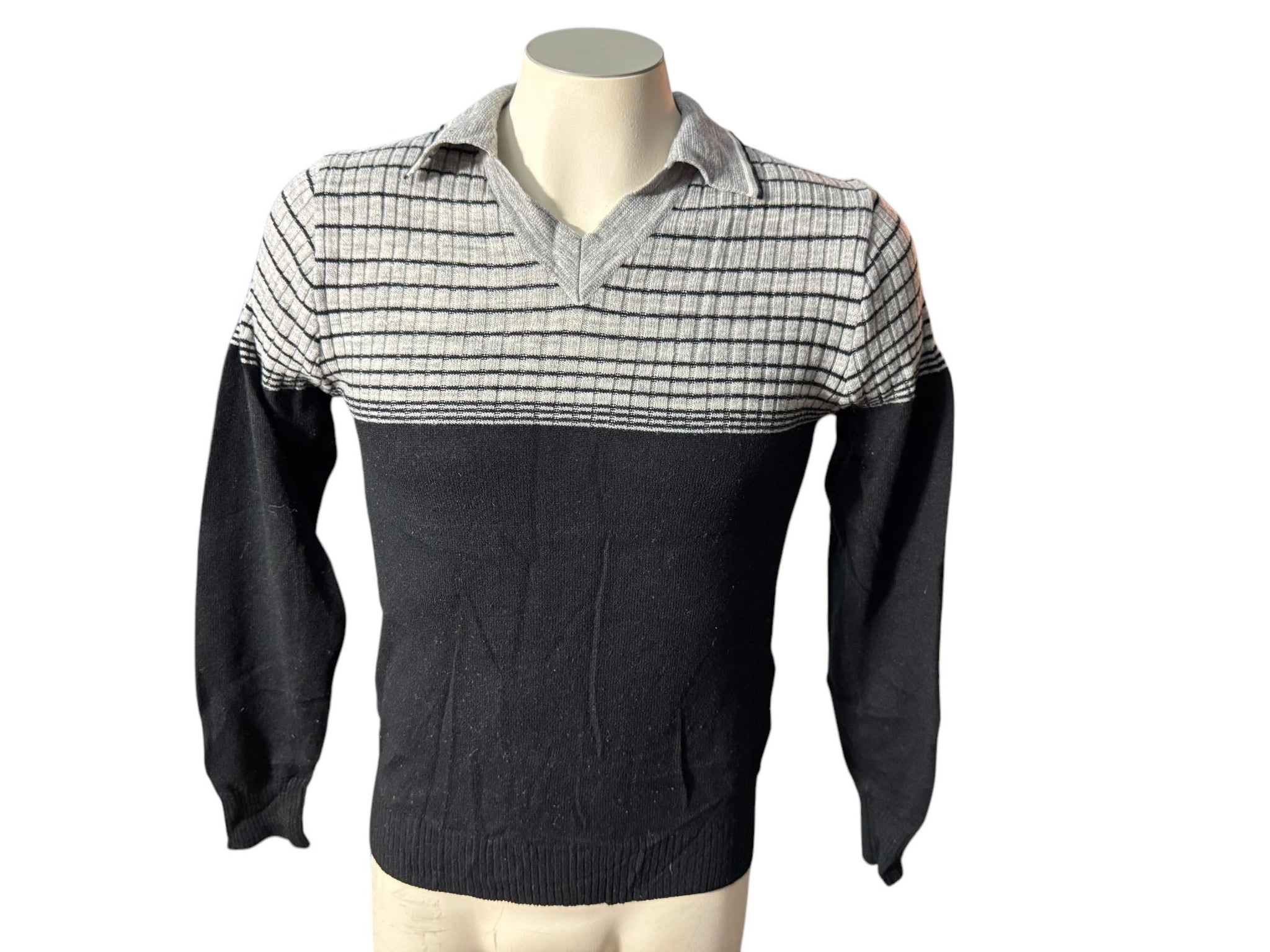 Vintage 70's sweater, tag says Mister Mab, sz M, 100% acrylic. Sweater is gray, black, and white. Sweater is in great condition, measurements are