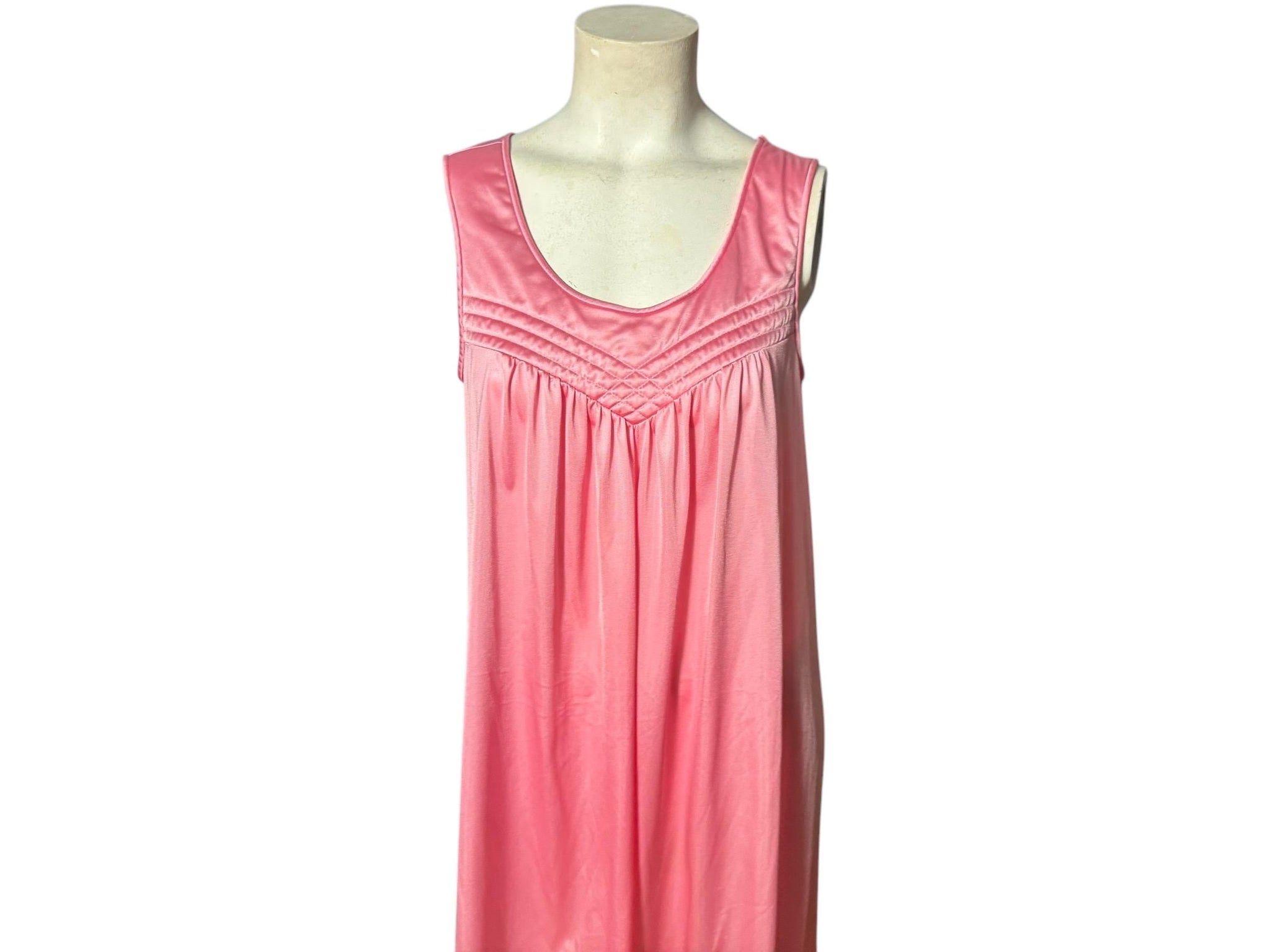 Vintage pink midi nightgown, tag says Vanity Fair, sz PTE, all nylon. Nightgown has no closures, decorative stitching at the top, tent like sillouette. Nightgown is in great condition, measurements are