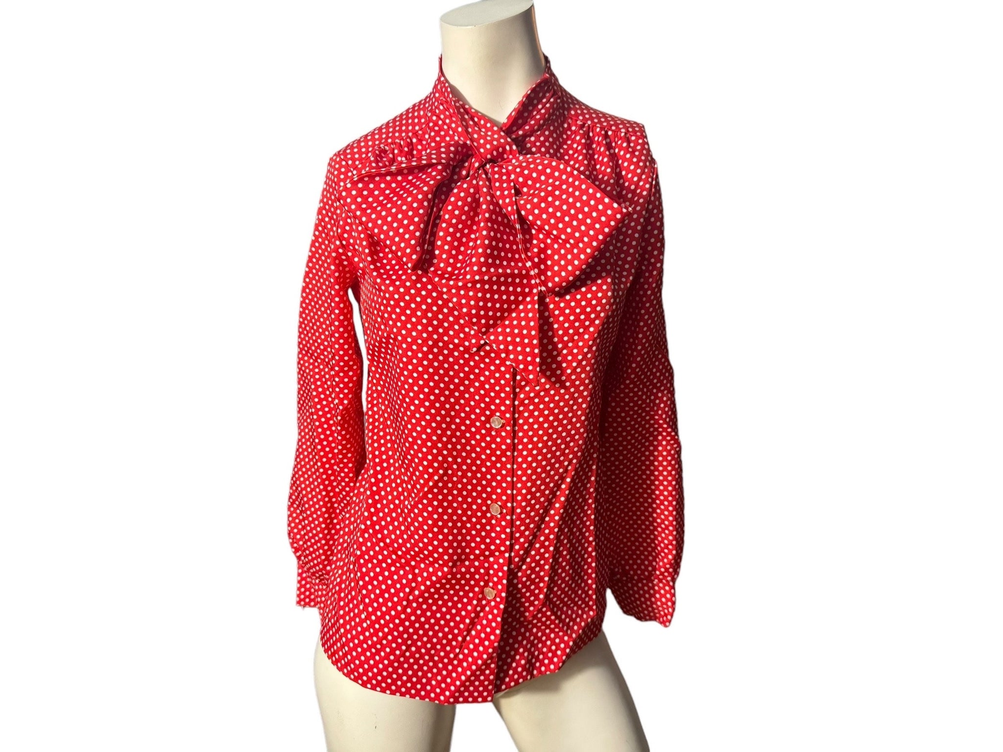 Vintage 70's red and white polka dot blouse, tag says Lee Mar of California, feels like polyester- no stretch. Shirt buttons up the front, has huge tie on front, in great condition, measurements are
