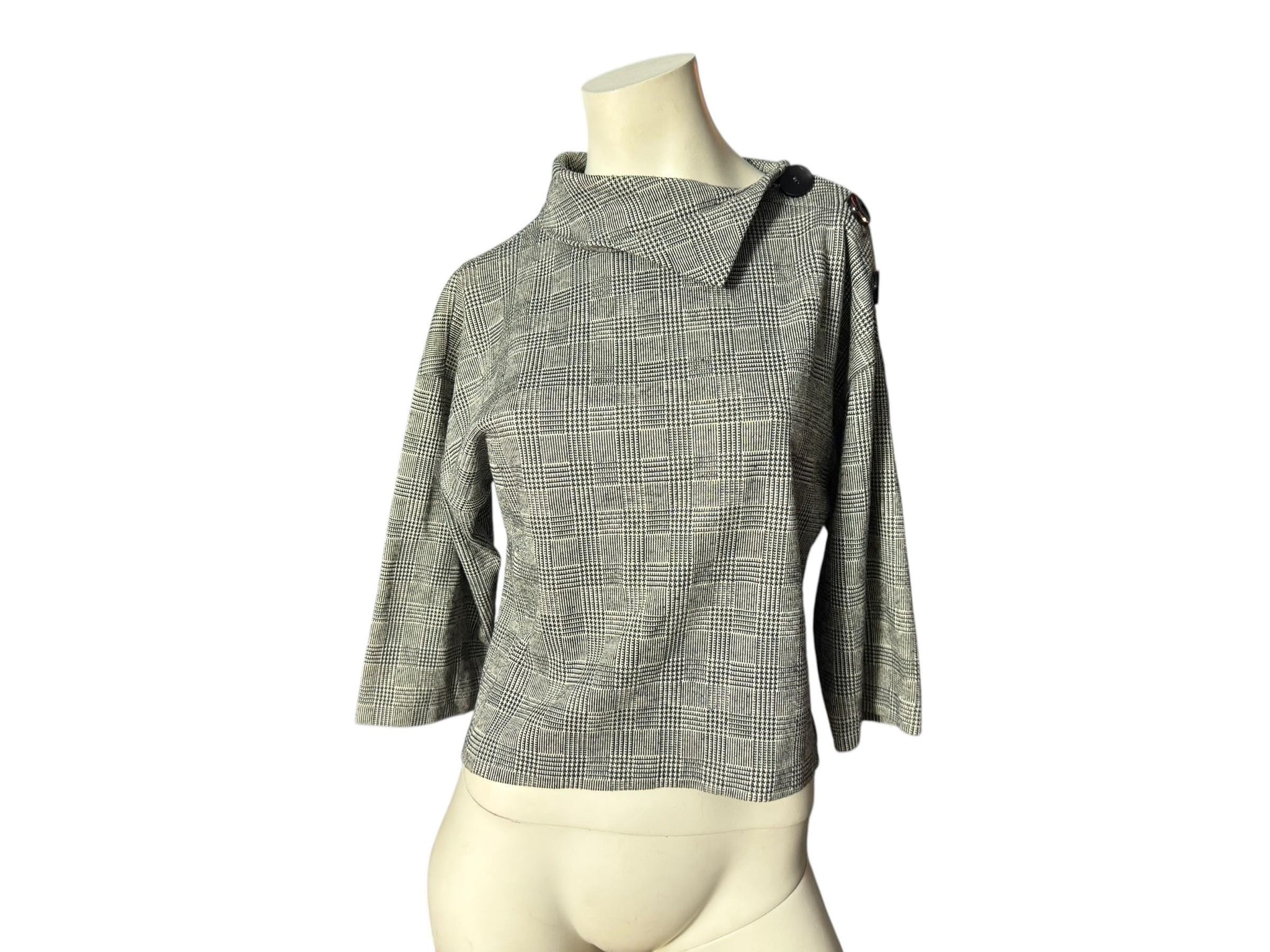 Vintage 80's black & white top, tag says It's Pure Gould, sz XS, top has half sleeves, 80's cut, buttons down 1 arm. Top is in great vintage condition, measurements are