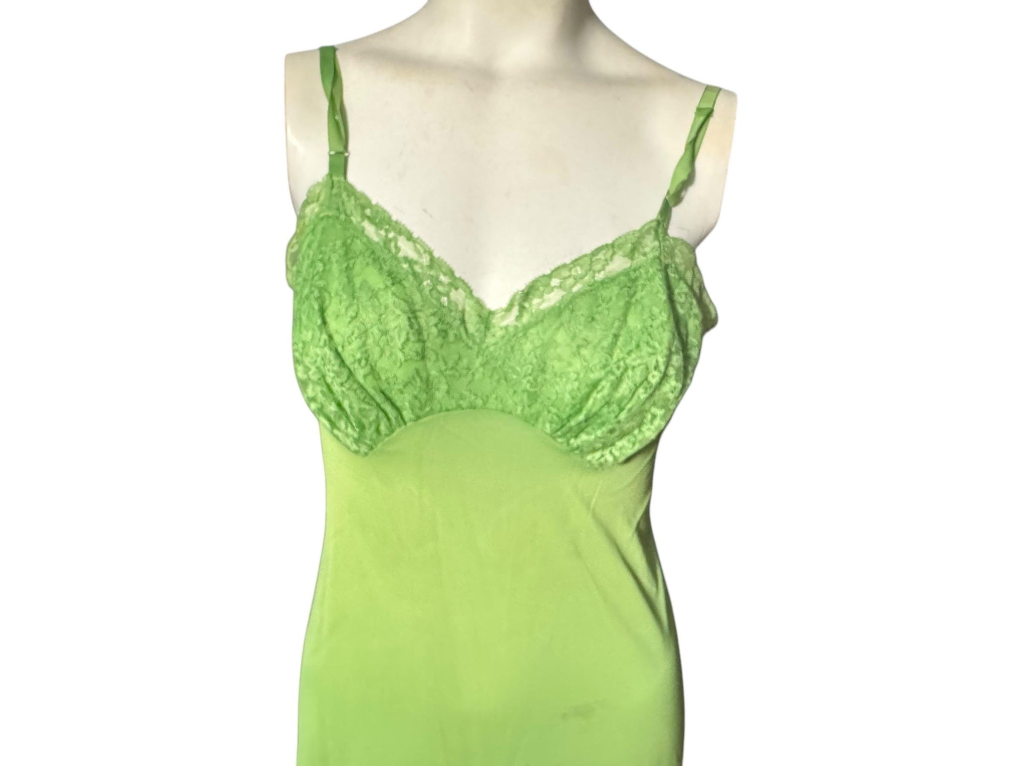 Vintage green 60's slip, tag says Vanity Fair, sz 32 S, all nylon. Slip has lace bust, adjustable straps, amazing lace panel at the bottom. Slip has staining on the front and strap, measurements are