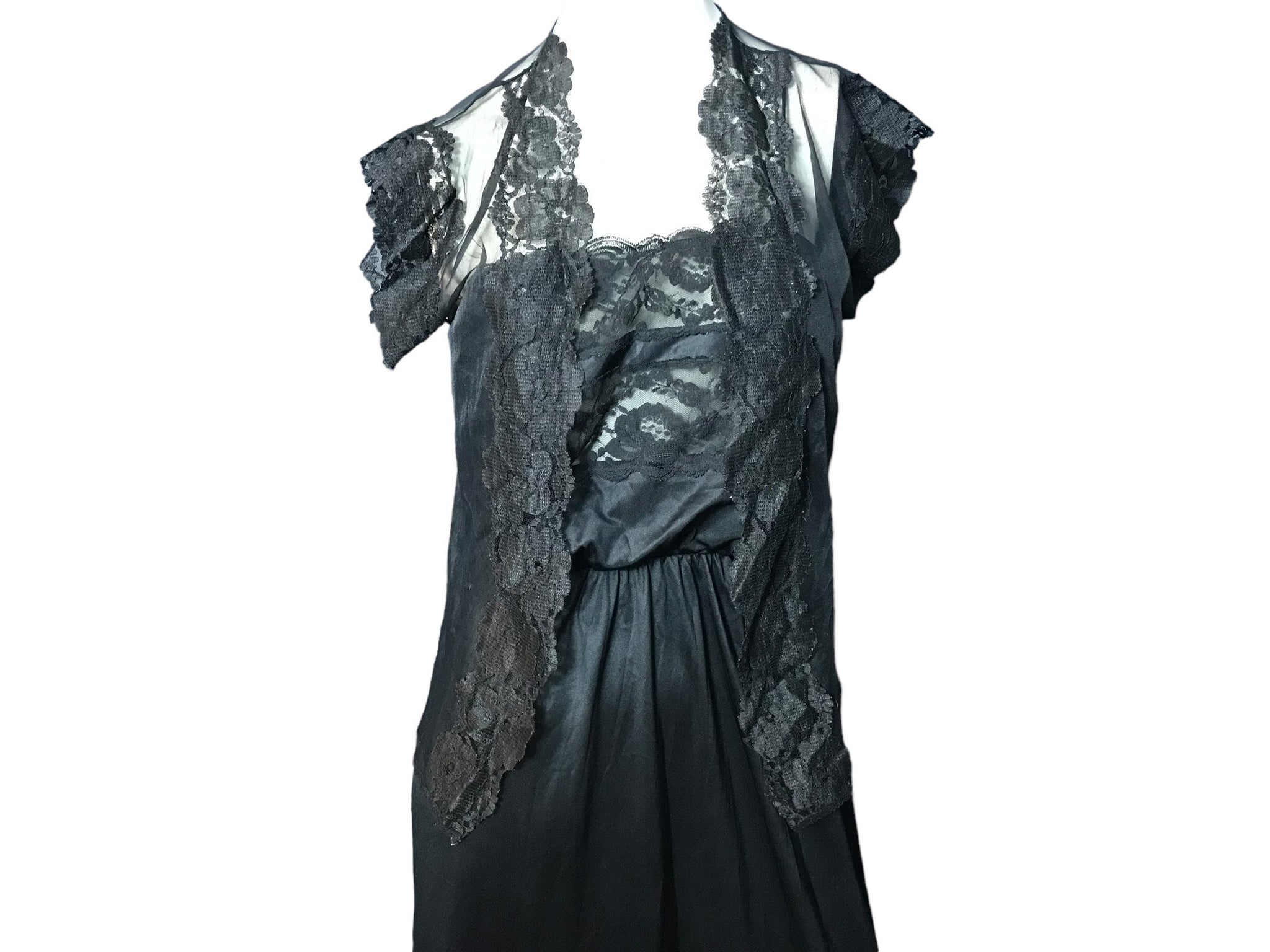 Vintage black nightgown set, tag says Deena, sz medium, 100% nylon. Nightgown has a sheer lace bust, elastic waist, top is sheer, and trimmed in lace. Set is in great condition, measurements are