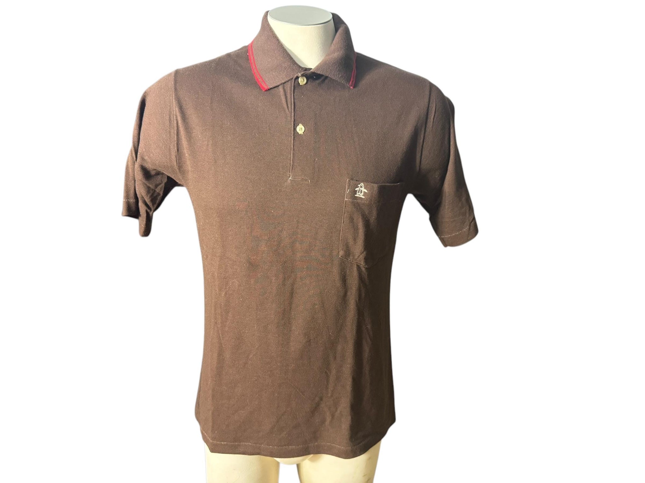 Vintage brown polo shirt with red stripes, tag says Grand Slam Munsingwear, 50% polyester 50% cotton. Shirt is button neck, front pocket with penguin, measurements are