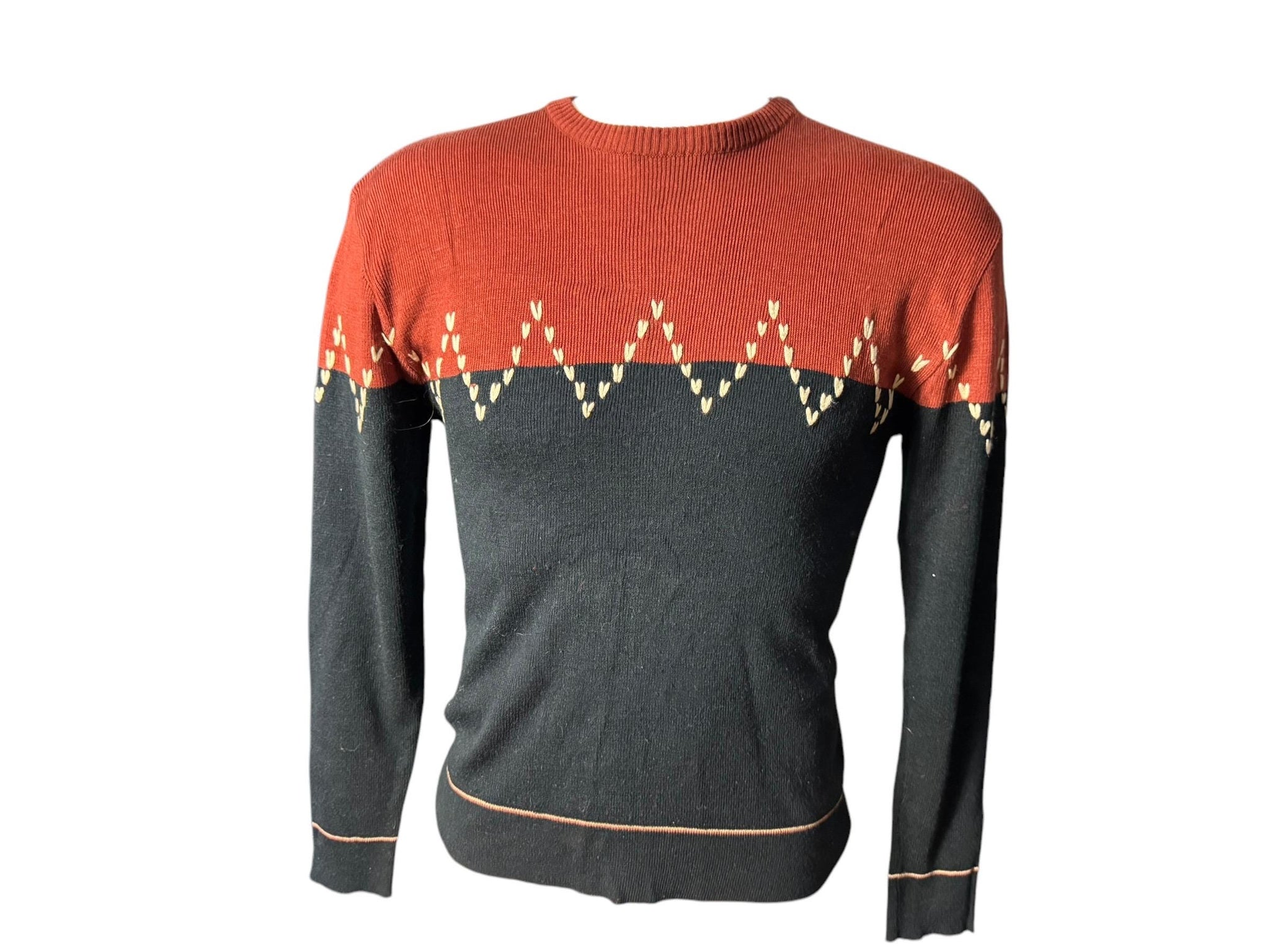 Vintage 70's sweater, tag says Sundowner by Erica Stasberg, sz L, 100% acrylic. Sweater is rust and black, with amazing off white stitched design. Sweater says L- seems more of a small or medium for men, maybe a L for a women, sweater is in great condition, measurements are