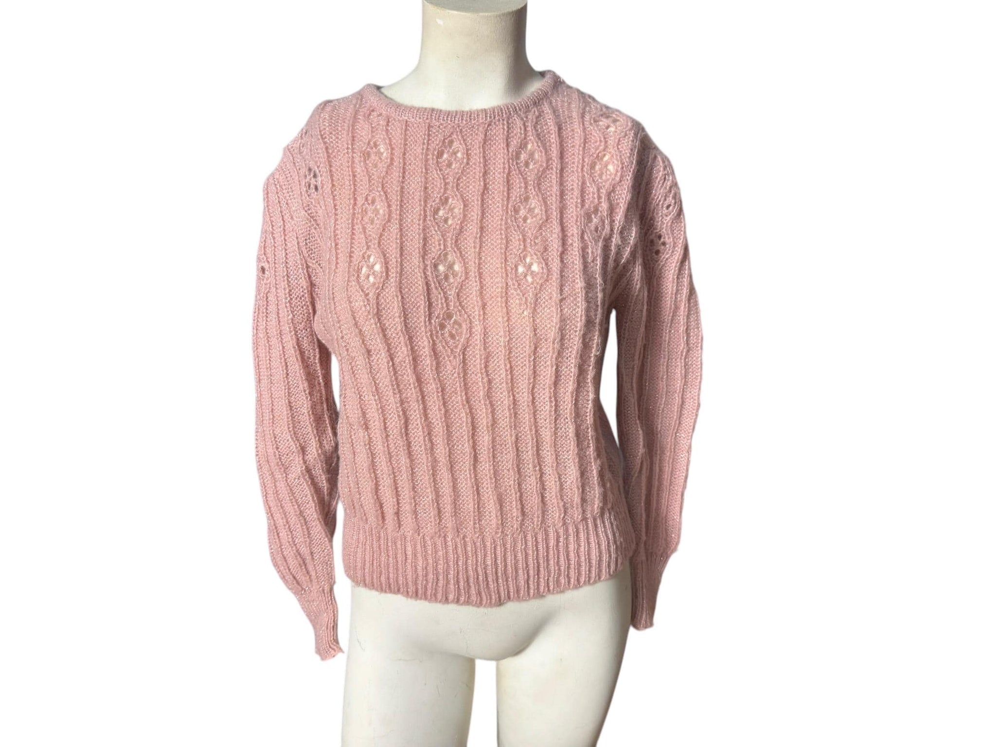 Vintage pink sweater, tag says Ginenne, sz M, 90% acrylic, 10% metallic. Sweater has openwork knitting, rose pink with silver threading, in great condition, measurements are