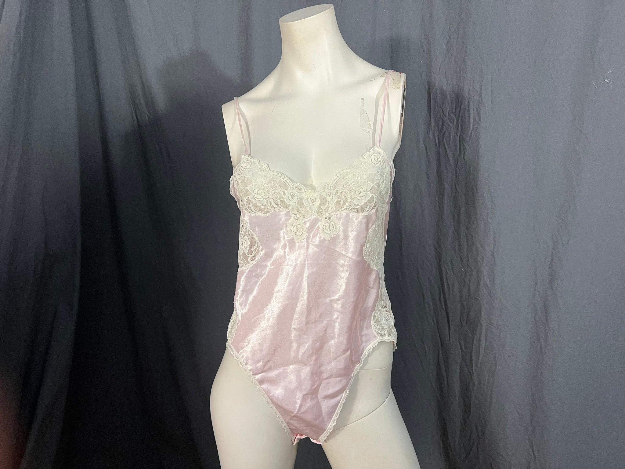 Vintage 70’s pink teddy, tag says sz small, 100% polyester. Teddy is light pink, has off white lace detailing, snaps on the panty area, has a satin feel. Teddy is in great condition, measurements are
