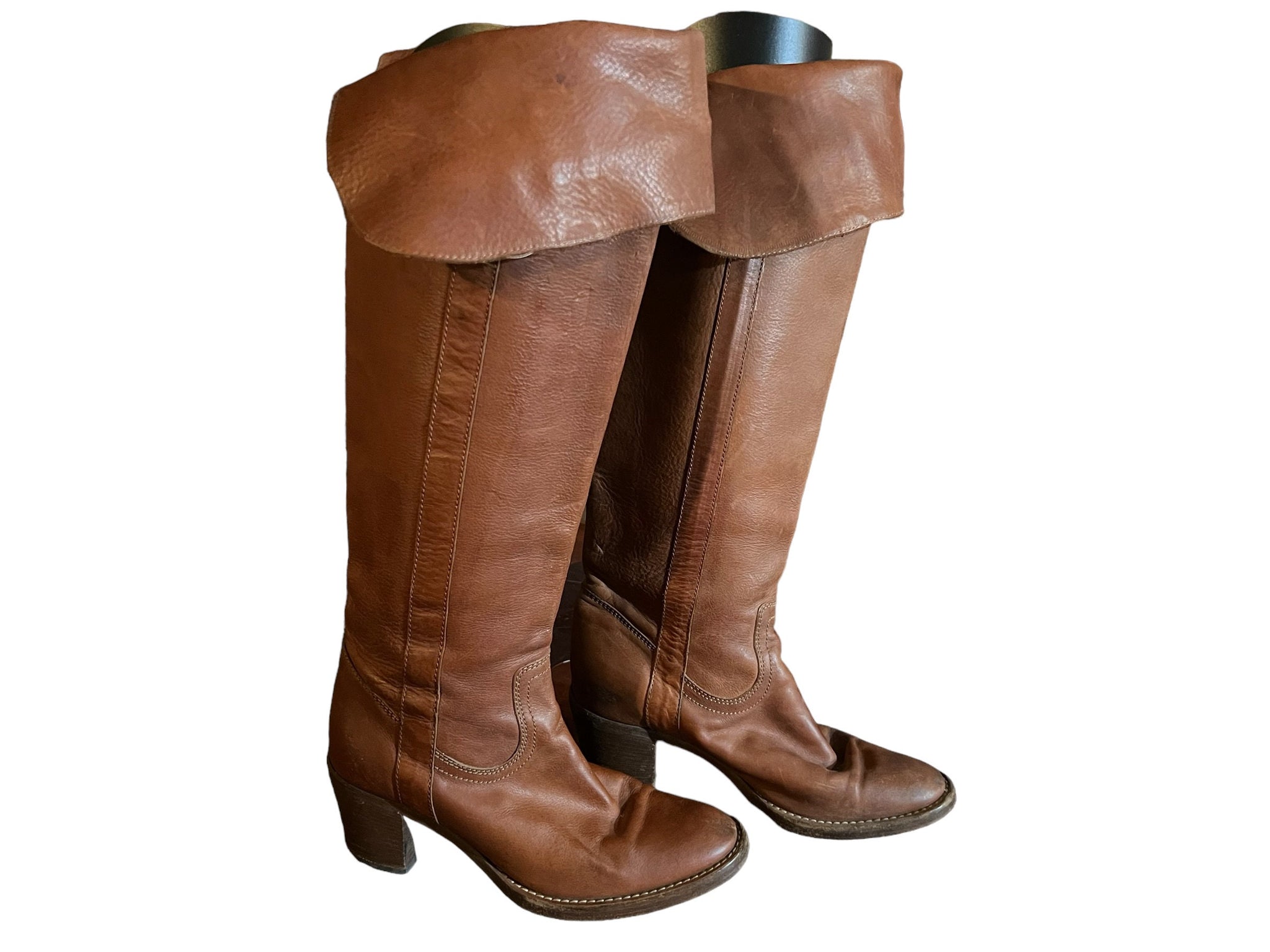 Vintages knee high leather boots, bottom says Ralph Lauren Collection, made in Italy, sz 6.5 B. Boots have a broken in look, fold over cuff, western style, stacked wood heel. Boots are in good vintage condition, measurements are